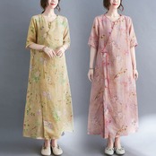 コットンとリネンのドレスの女性の 2021 年夏緩い大きいサイズミッドレングス気質斜めプリント中国風の改善されたチャイナ ドレススカート 大きめサイズ サマー 夏物 sine92568142864