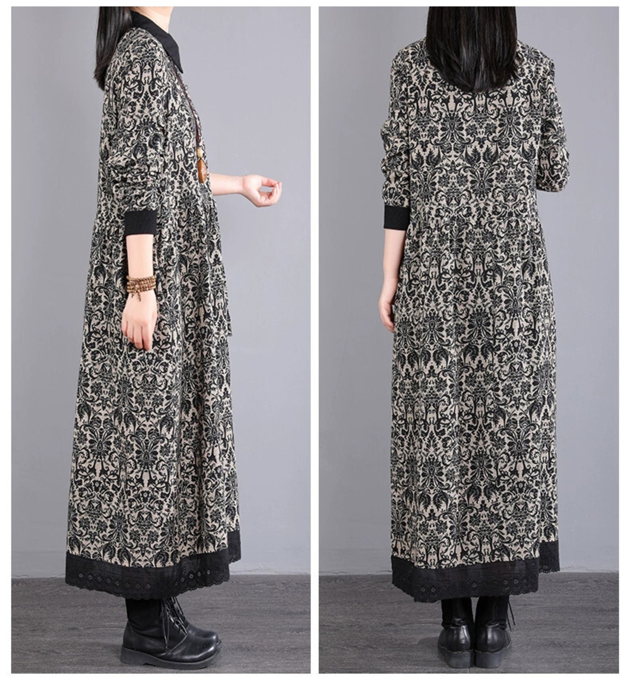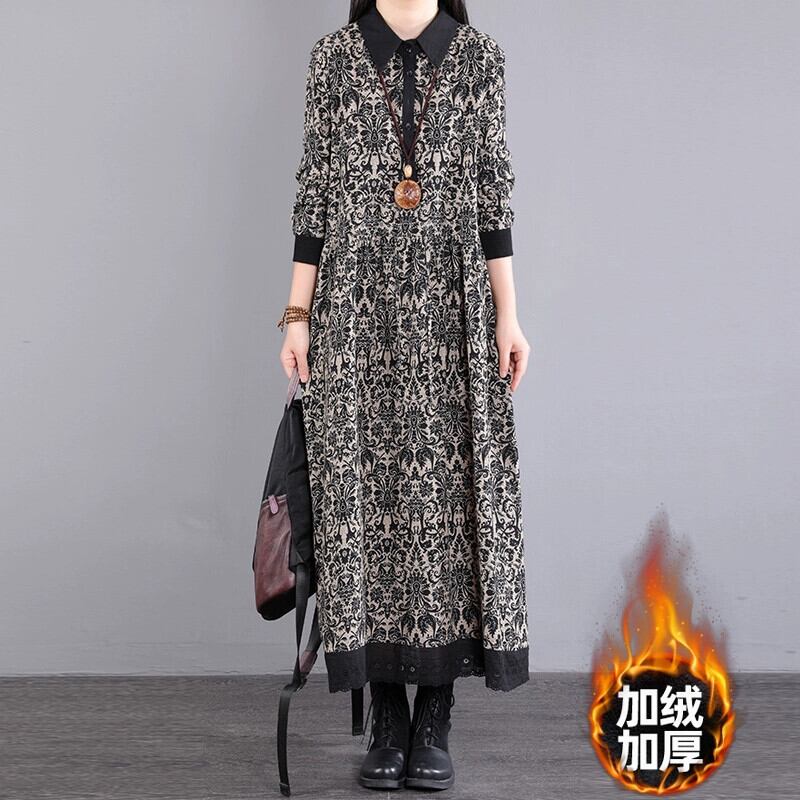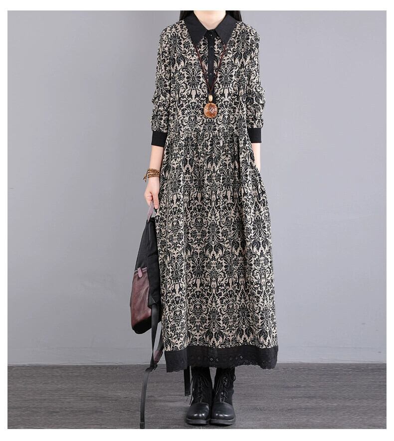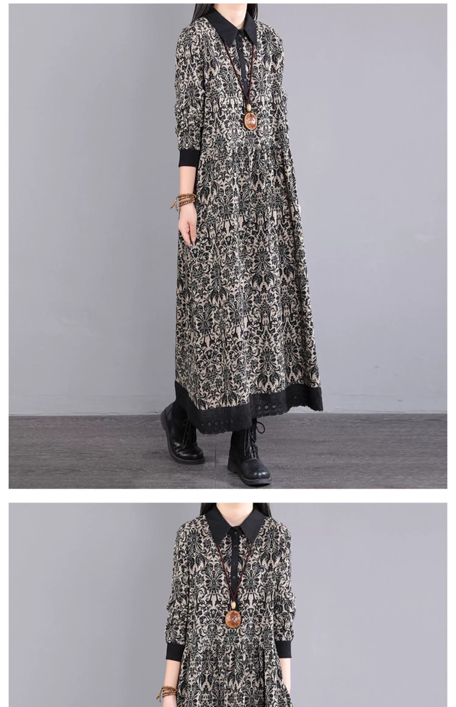 クリアランス漏れ〜既製の女性用レトロ花柄コットンとリネンのドレス、ルーズベルベットと厚みのあるラペルのシャツドレス sine1582981963