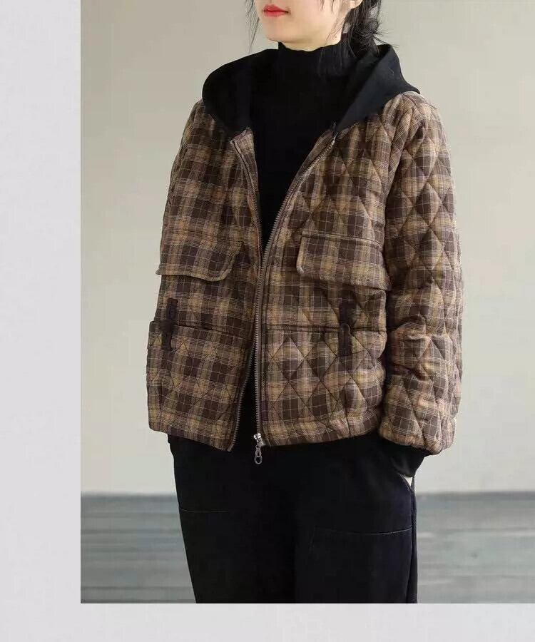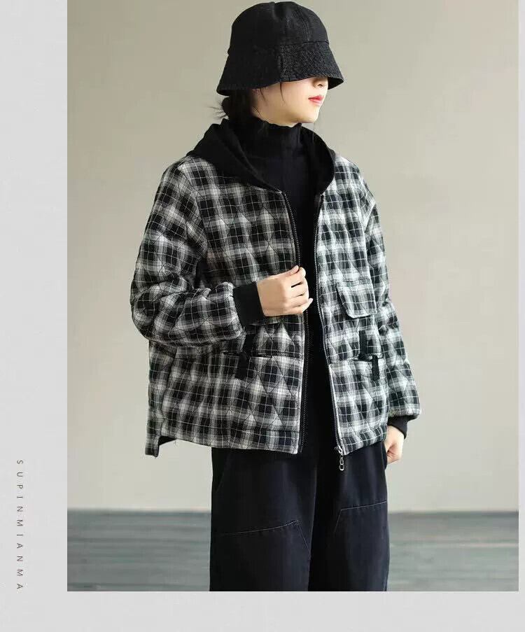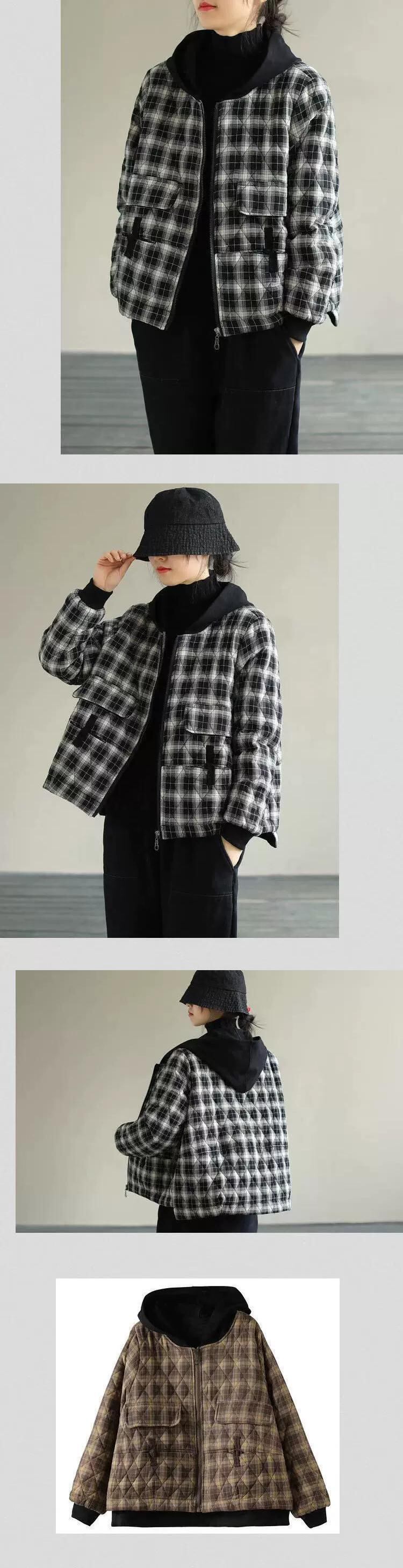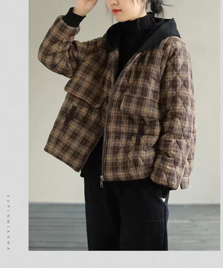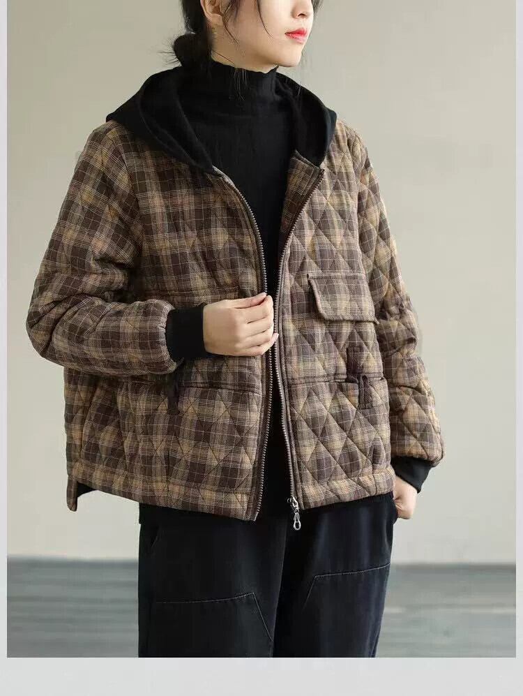ディスカウントストアショッピングモール撤退女性の厚く暖かいフード付きコットンジャケットルーズレトロキルティングチェック柄コットンコート sine99623643009