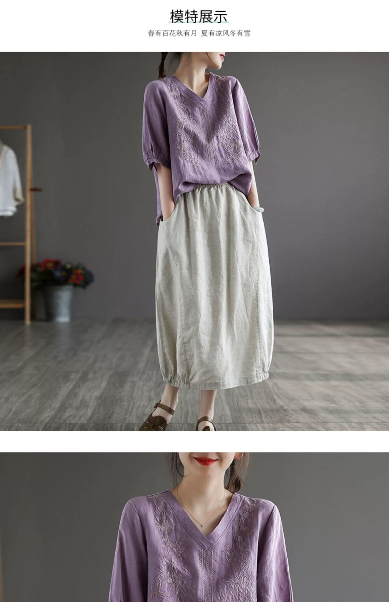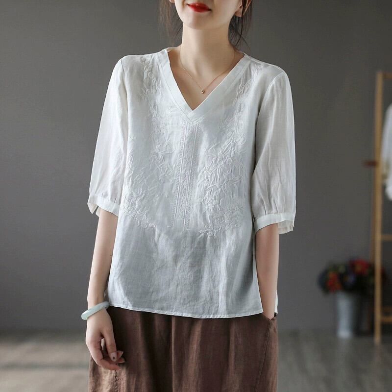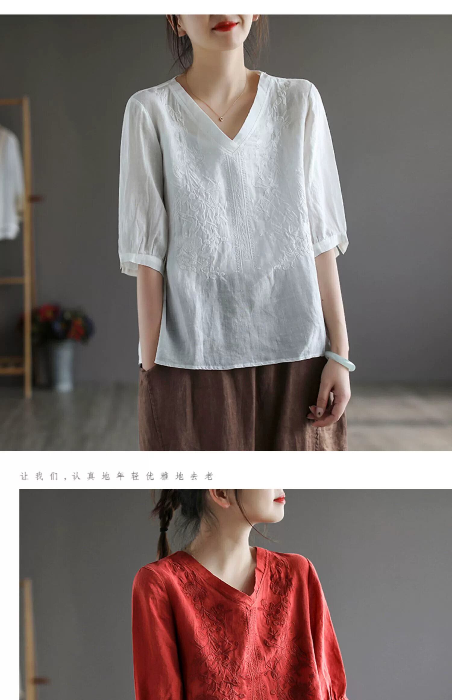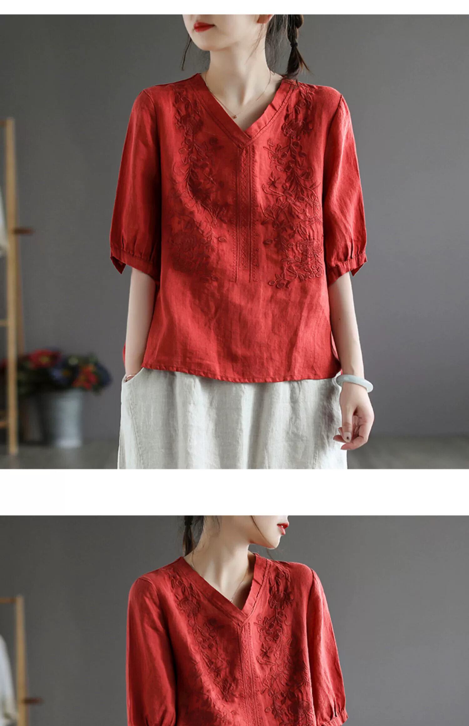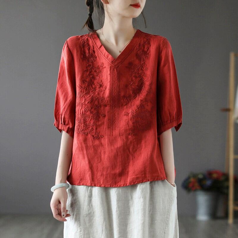 第一線の ese とブランド eign trade 割引シアーラベルレディースラミー V ネック刺繍シャツトップコットンリネン半袖 T シャツ夏 レッド サマー 夏物 Vネック Tシャツ sine70375380877