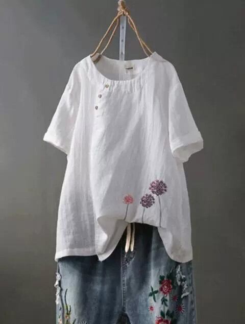レトロプラスサイズの女性の夏 2021 綿とリネン半袖シャツルーズフラワー刺繍薄手のリネンカジュアル Tシャツトップ レッド コットン 大きめサイズ サマー 夏物 フラワーデザイン sine57388301169