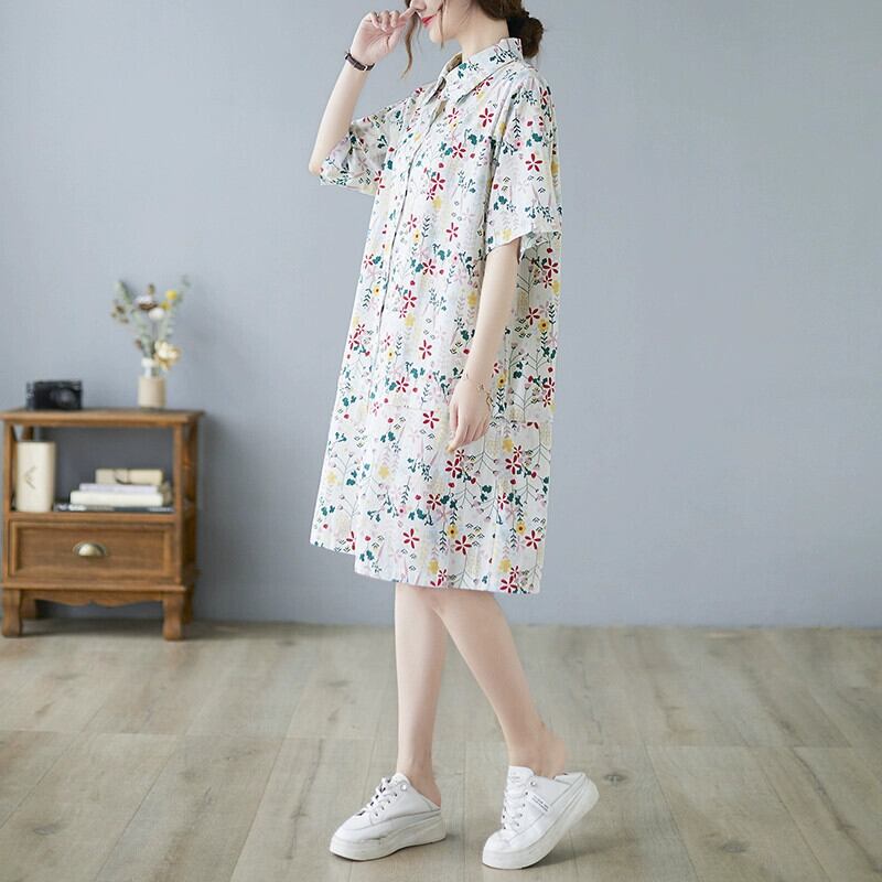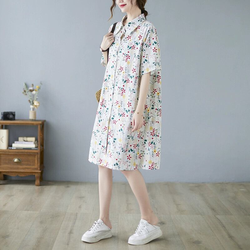 脂肪姉妹花柄ドレス夏 2021 新しい大きいサイズ緩い肌カバー気質ラペルミドル丈シャツスカート 大きめサイズ サマー 夏物 sine12377554709