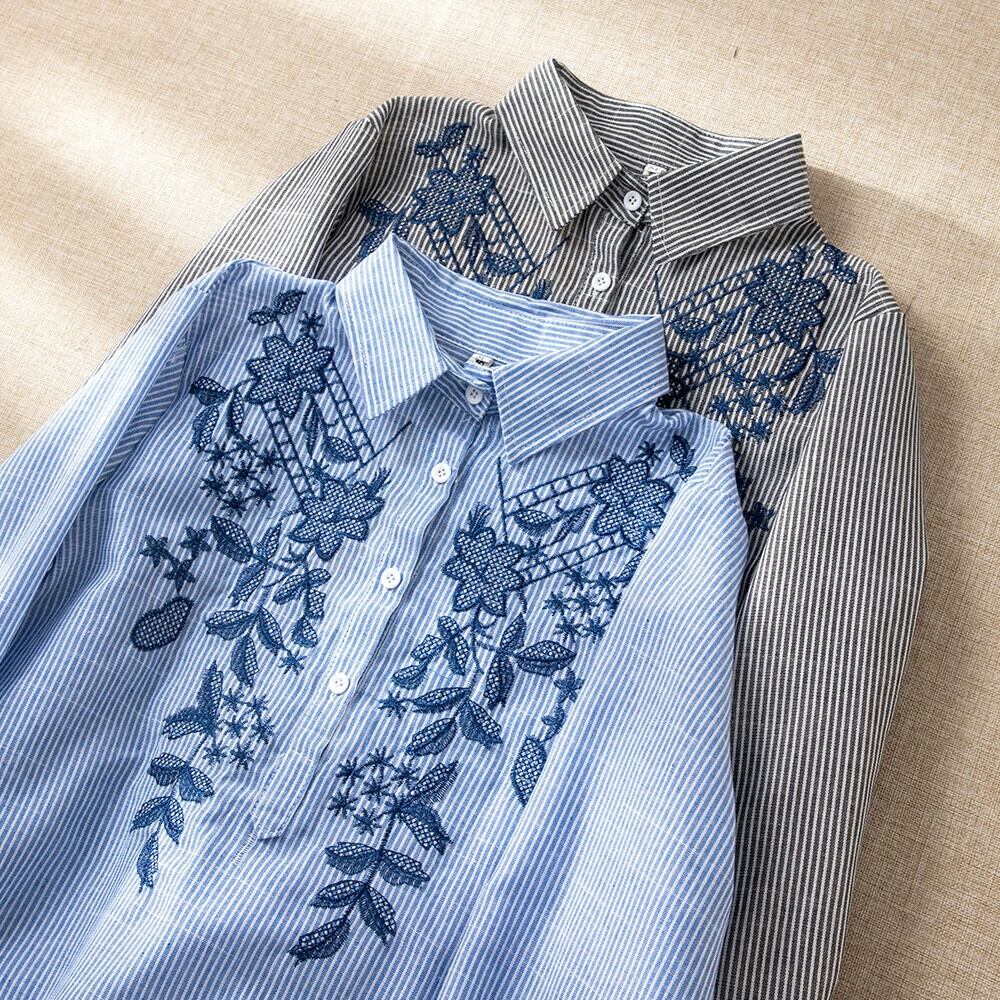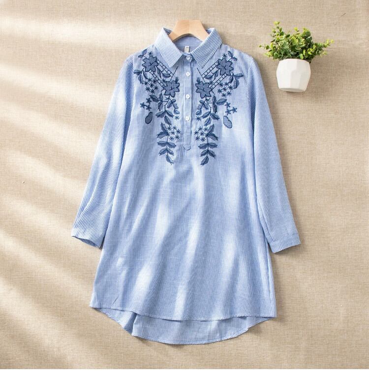 ディスカウントストアの有名カウンター引き出しクリアランスレディースラミー長袖シャツレトロ刺繍ラペルストライプコットンとリネントップ ロング レッド sine76705707373