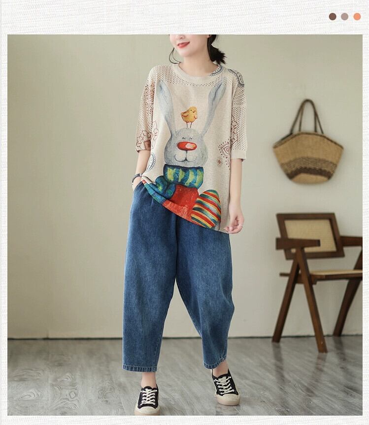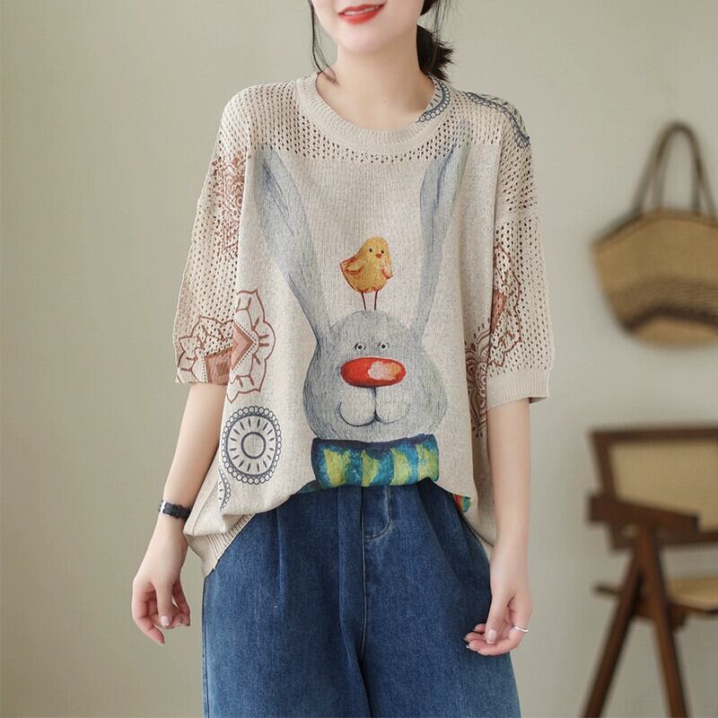 第一線のブランド eign trade 撤退 ese スタイルの漫画プリントニット T シャツの女性のルーズカジュアル半袖トップ薄い Tシャツ sine48885323879