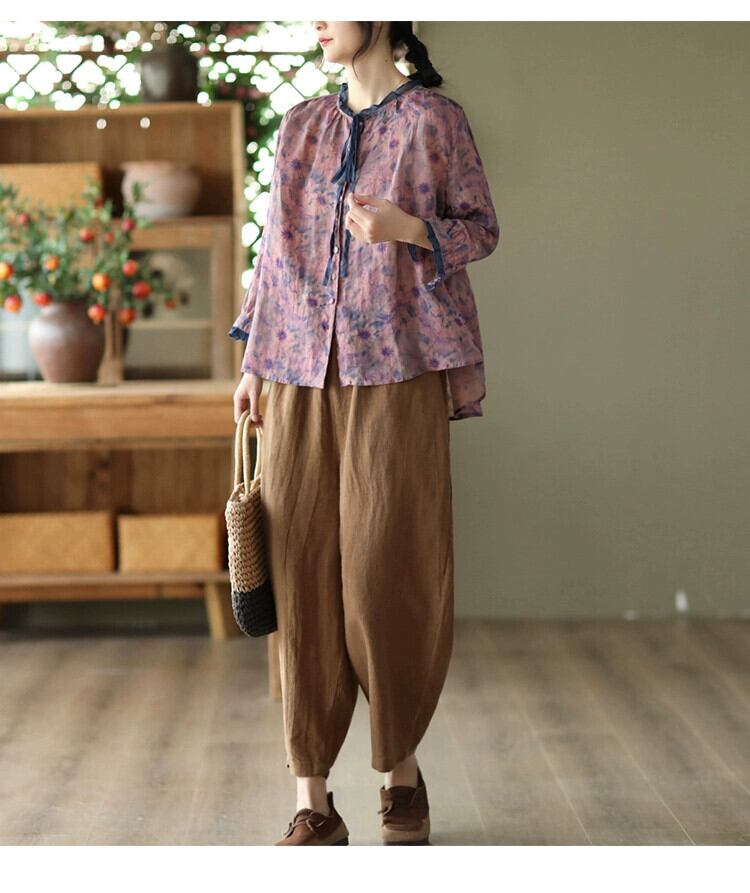 eign trade ese オリジナルの有名な既製のコットンとリネンの花柄長袖シャツ女性ルーズレースアップ菌襟リネントップス ロング sine48650071165