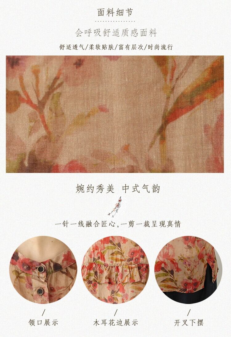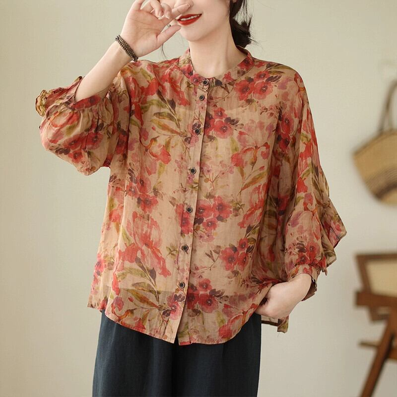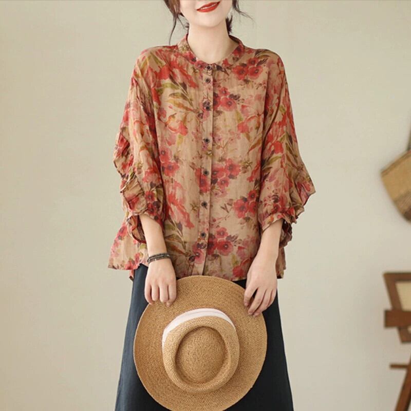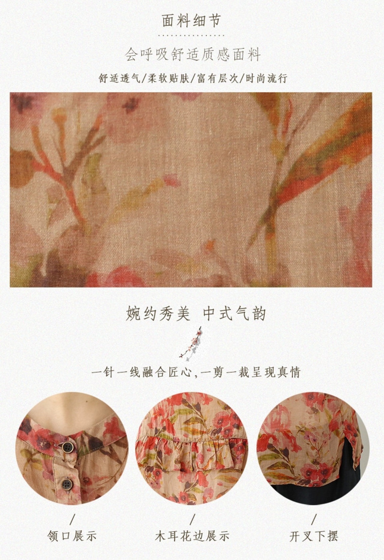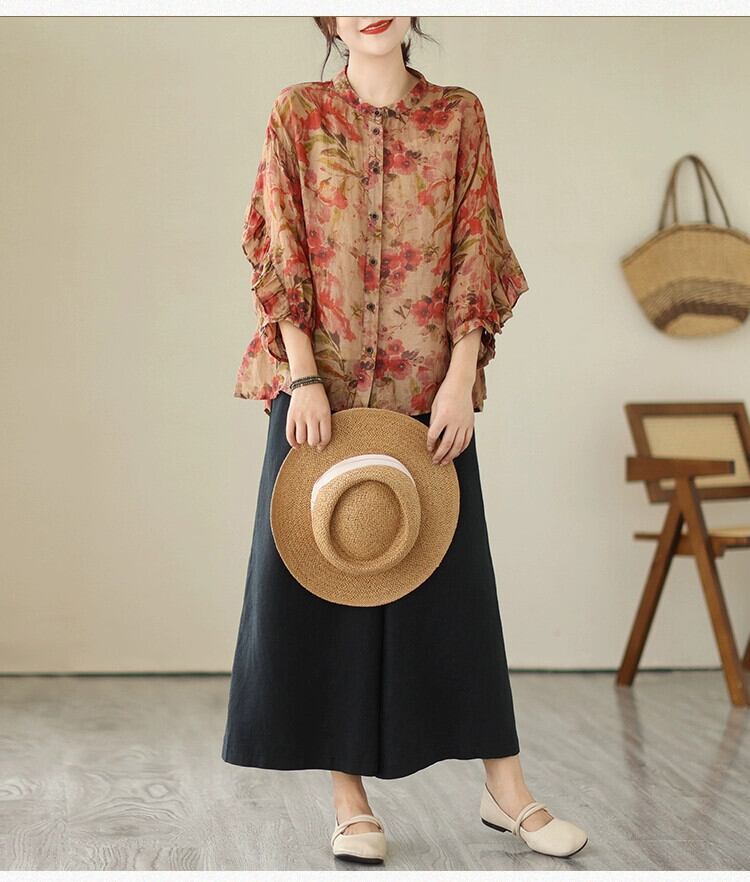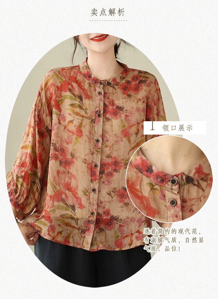 eign trade ese オリジナルハイエンドブランドプリント綿とリネンのランタンスリーブシャツ女性のゆったりした気質のリネン長袖トップ ロング コットン sine11616896282