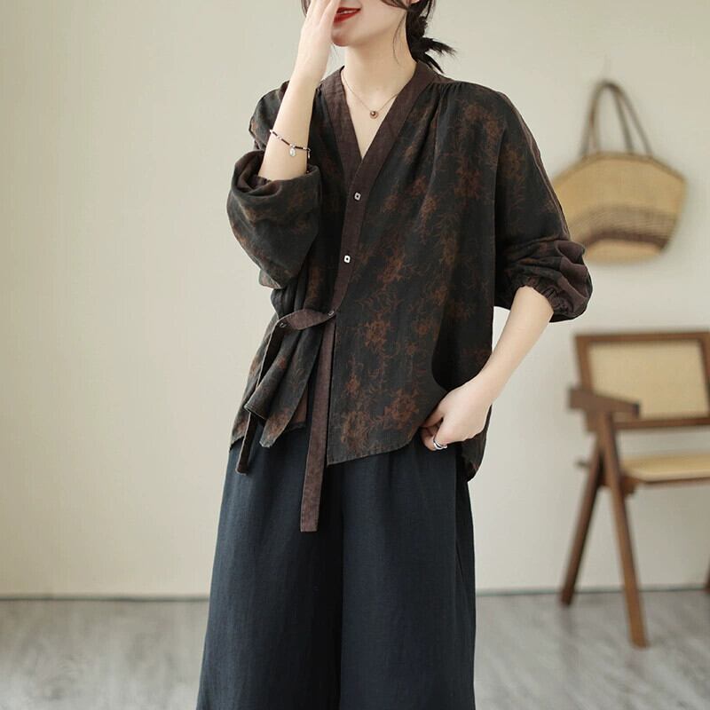 Eign Trade Export Big Tail Goods 撤退レディースレトロ中国風プリントコットンとリネンシャツルーズ V ネックリネントップ夏 サマー 夏物 Vネック sine594297827
