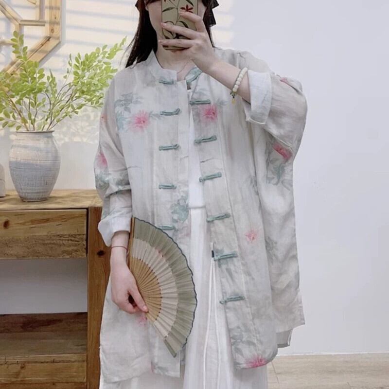 カウンタークリアランスクリアランスチャイナスタイルバックルラミーシャツレディースルーズプリントミッドレングスコットンとリネントップ sine18387359769