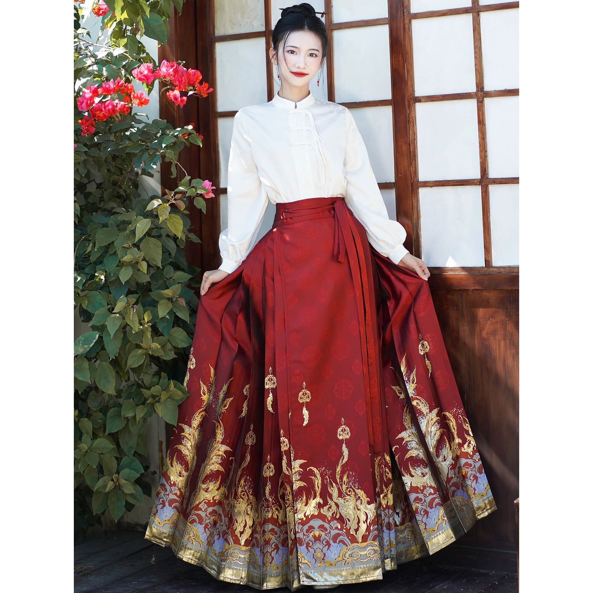 中国風の改良された明朝の漢服スーツの女性、春と秋の古代風の赤い馬の顔のスカートとトップのツーピースセット レッド スプリング 春物 オータム 秋物 sine28790532851