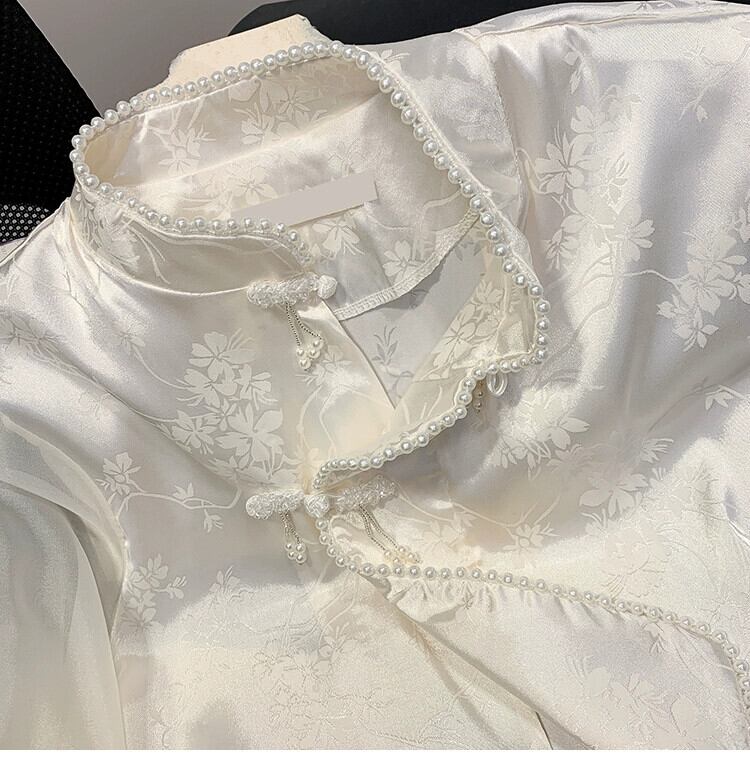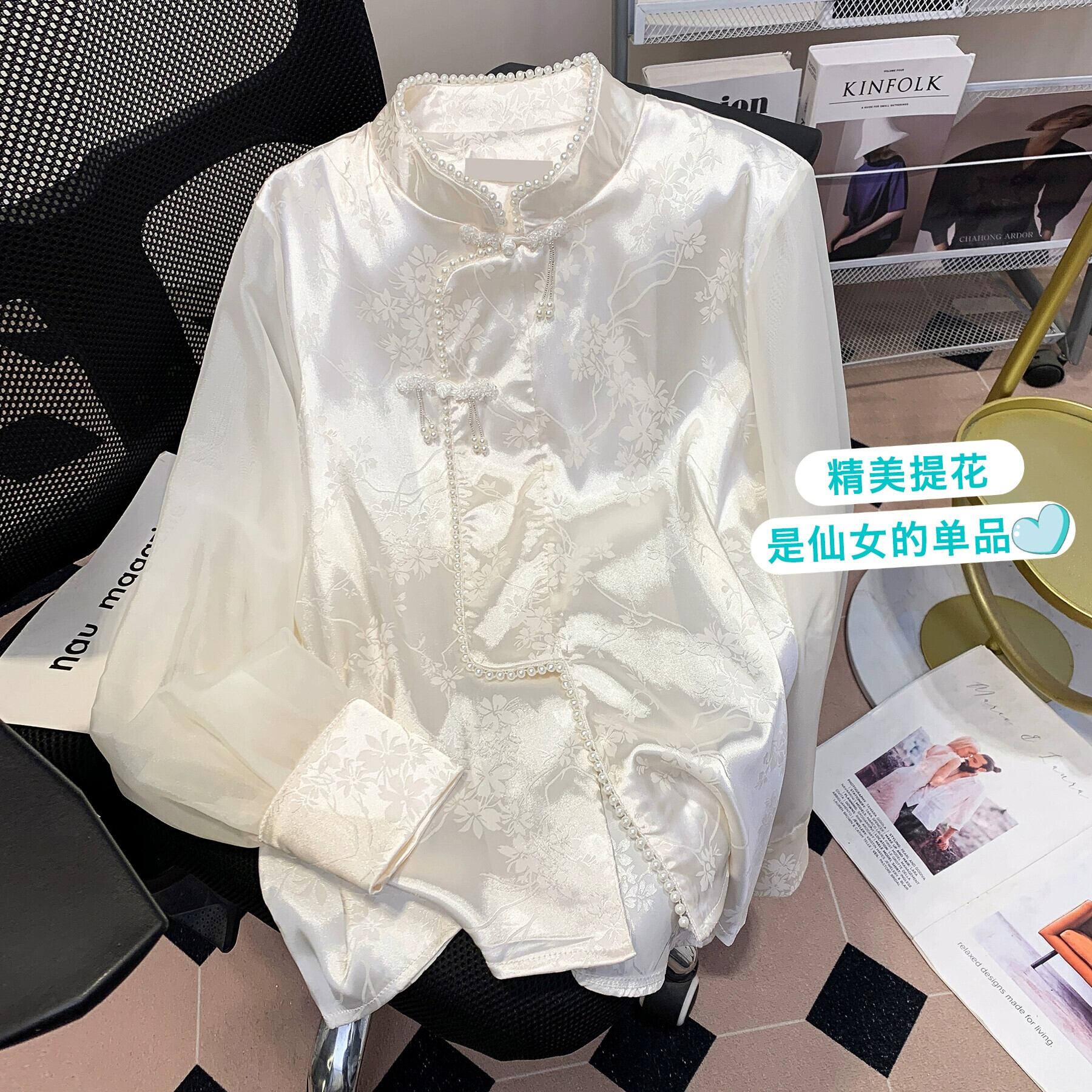 中国風の重工業ビーズアセテートシャツ女性の春と秋のスタイルのハイエンドの気質軽い国民風のディスクボタンスタンドカラー長袖トップ ロング スプリング 春物 オータム 秋物 sine18279574583