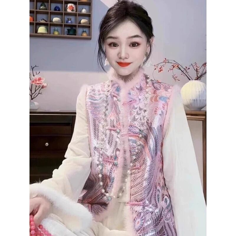 中国風の重工業刺繍ベストジャケット女性の秋と冬のスタイルハイエンド国家スタイルのディスクバックル生エッジチョッキベストトップ レッド オータム 秋物 ウィンター 冬物 sine43883617277