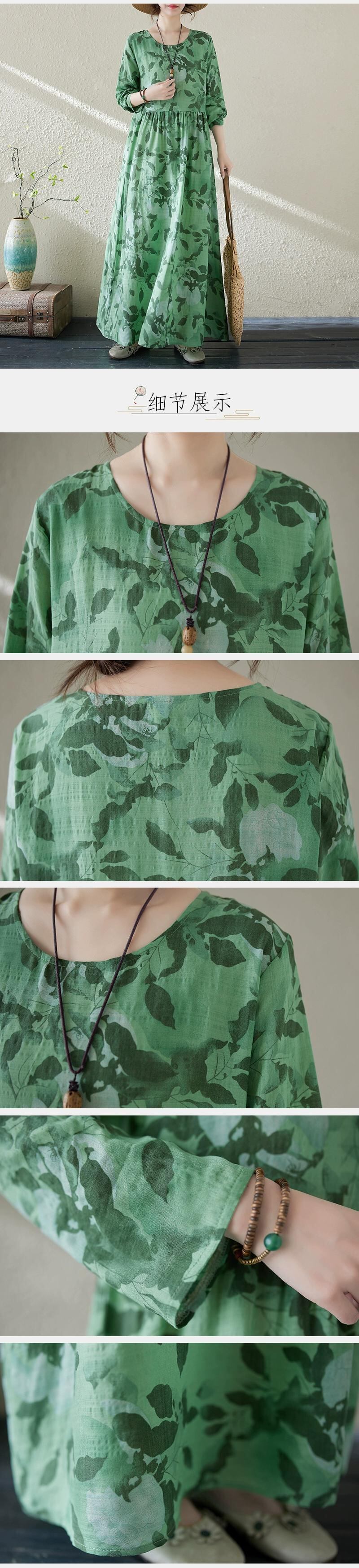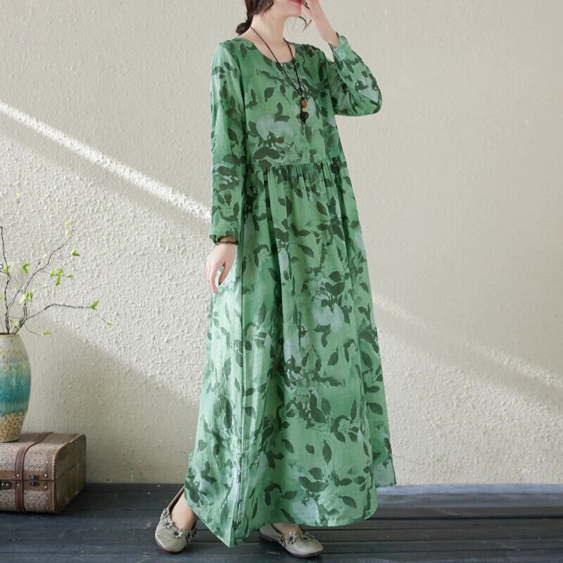 文学的でカラフルな綿と麻の長袖ドレス、春先の女性、大きいサイズ、ゆったりとスリム、レトロなラウンドネックのリネンローブ ロング コットン 大きめサイズ スプリング 春物 Oネック sine20196901030