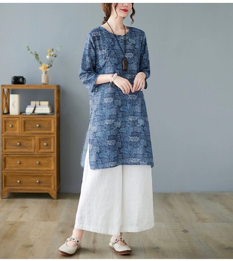 気質とファッショナブルな綿とリネンのスーツの女性の夏のプリント七分袖ミッドレングスシャツカジュアルワイドレッグパンツリネン2点セット コットン サマー 夏物 sine44522253125