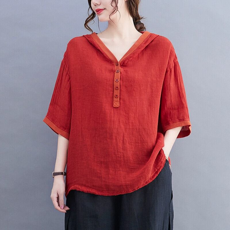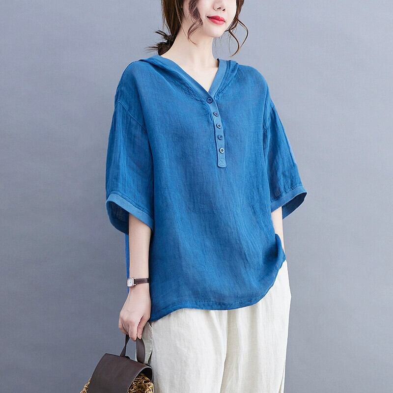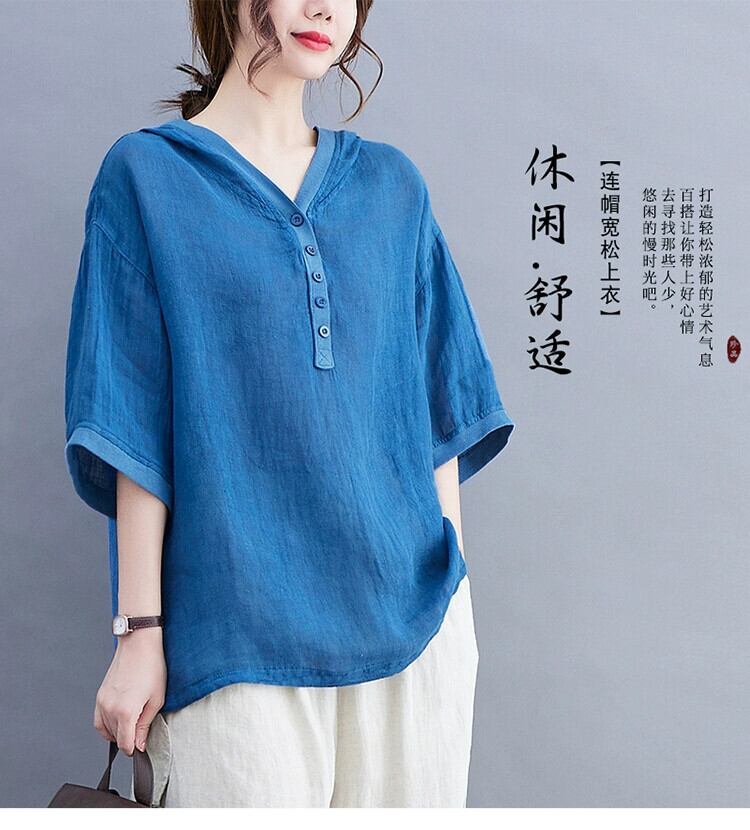 文学プラスサイズの女性のフード付き半袖 T シャツ夏ルーズファット mm 肌カバーソリッドカラー日焼け止めシャツ綿とリネンのシャツトップ コットン 大きめサイズ サマー 夏物 Tシャツ sine42897013038