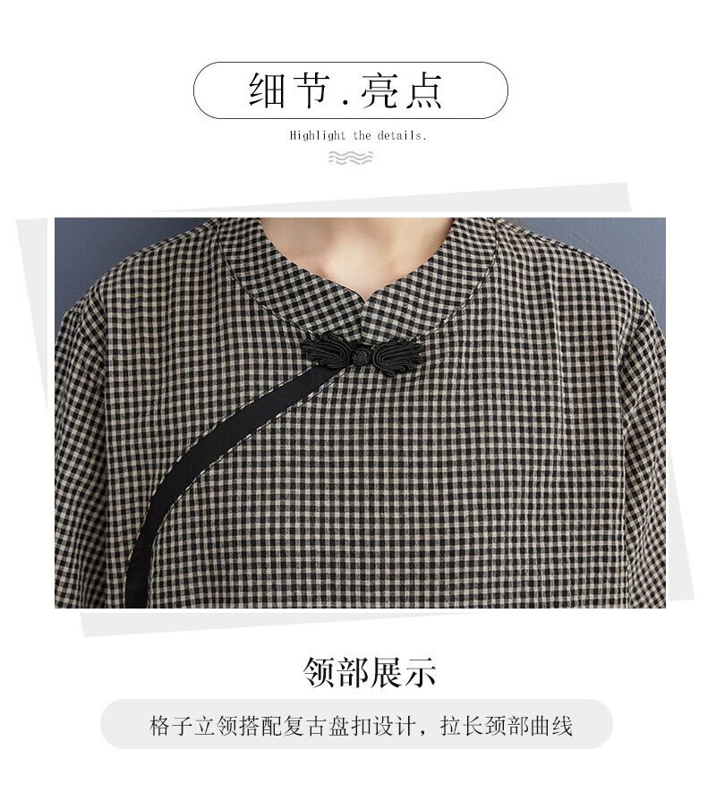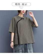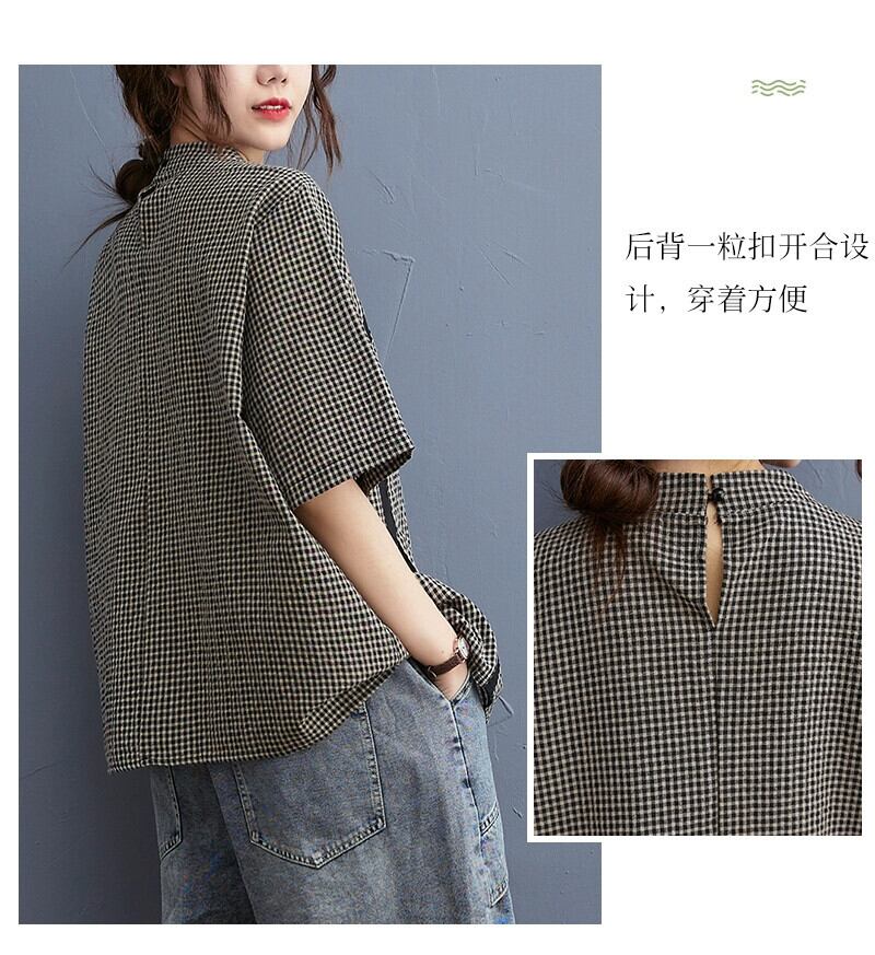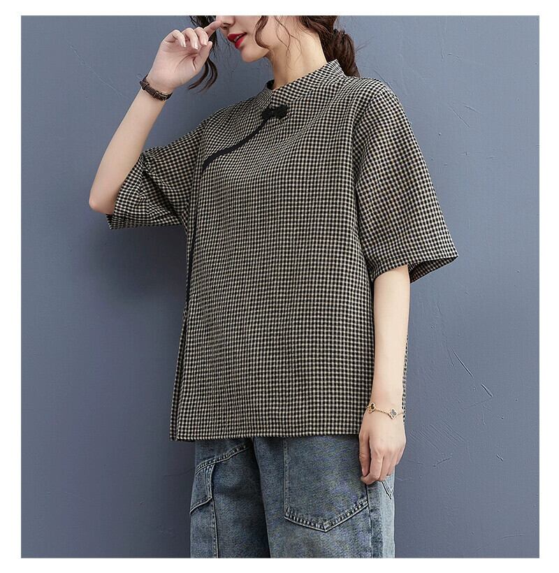 西洋風の綿と麻のシャツの女性、ゆったりとした大きいサイズ、芸術的なチェック柄のプレートボタン、スラントブレストのトップス、中国風のリネン半袖Tシャツ コットン 大きめサイズ sine33725190132