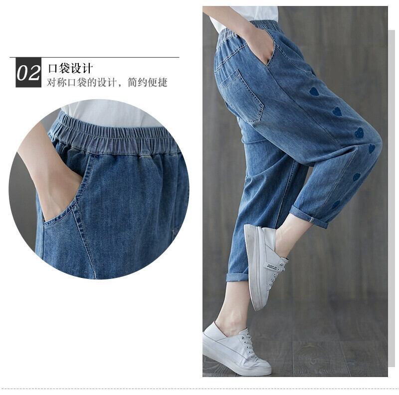 テンセルデニム ハーレムパンツ レディース 夏 太mm ウエストゴム ラブ刺繍 ゆったり 大きいサイズ カジュアル ライトブルー 9点パンツ エラスティック 伸縮 大きめサイズ サマー 夏物 sine89644170930