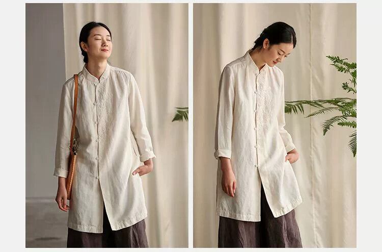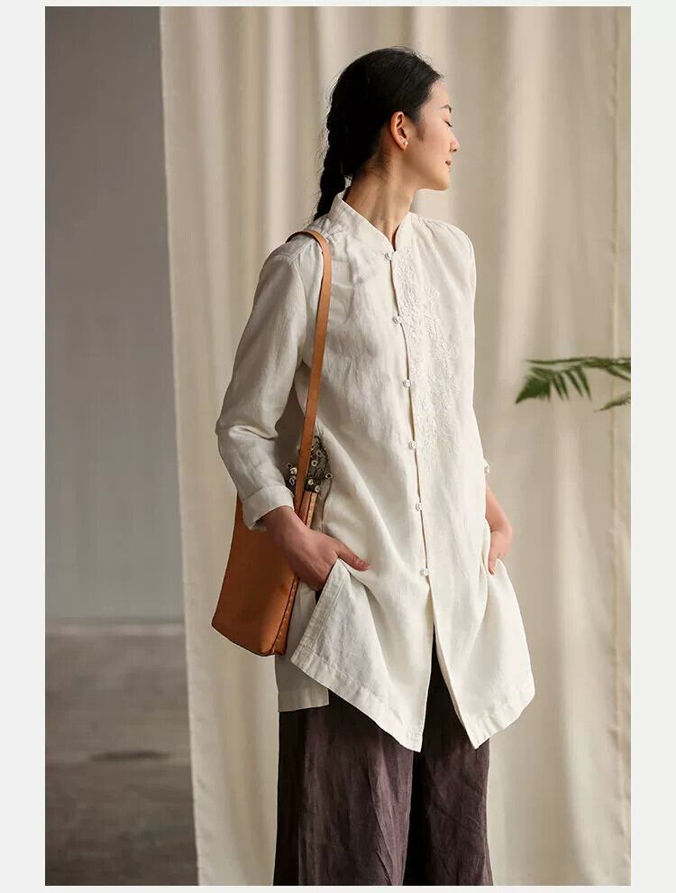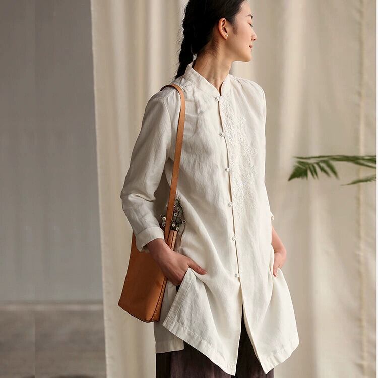 中国のボタンダウン綿と麻の刺繍シャツ、春と秋、ゆったりとスリム、レトロな国民風の禅茶服、麻の長袖トップス ロング レッド コットン スプリング 春物 オータム 秋物 sine58508182152
