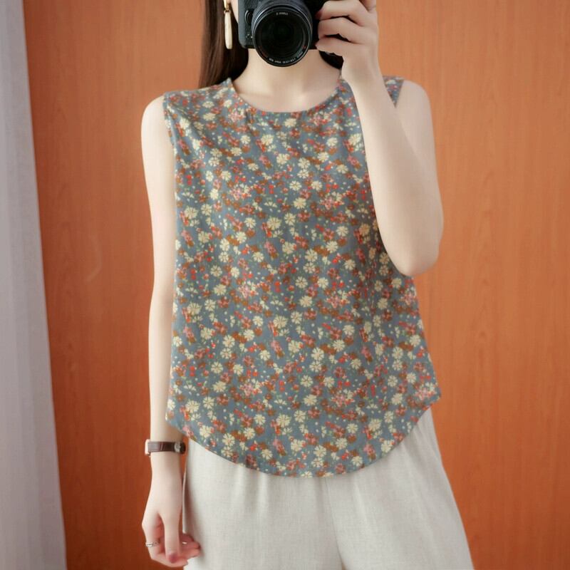 綿とリネンのベスト Tシャツ女性の夏 2021 新しい緩いレトロな年齢を減らす花柄薄いスタイルインナーカジュアルリネントップ コットン サマー 夏物 sine34425831563