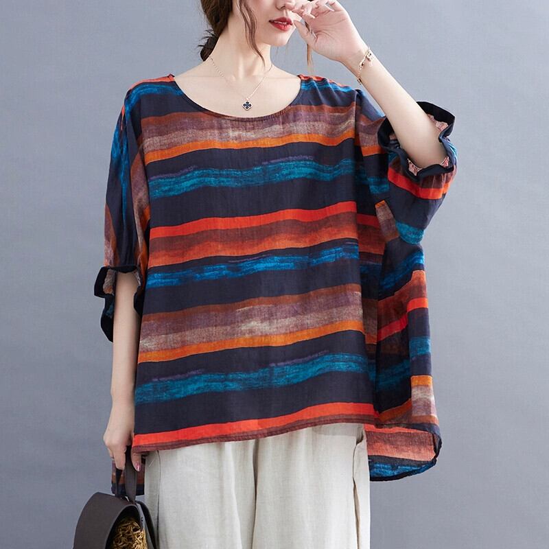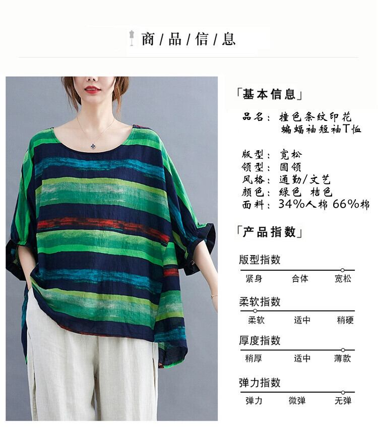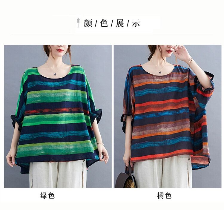特大サイズのレディースバットスリーブTシャツ、ゆったりと太った年齢を軽減するコントラストストライプがお腹をカバーし、スリムに見えるカジュアルトップス夏 大きめサイズ サマー 夏物 sine84379039113