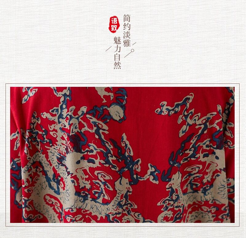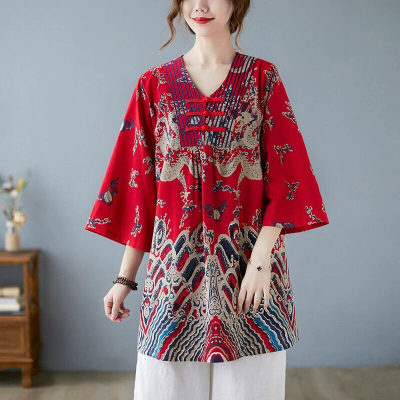 コットンとリネンの 5 分袖 Tシャツシャツ女性 2021 夏ルーズ大きいサイズエスニックスタイルプリントディスクボタン刺繍ラミートップ レッド 大きめサイズ サマー 夏物 sine72031288569