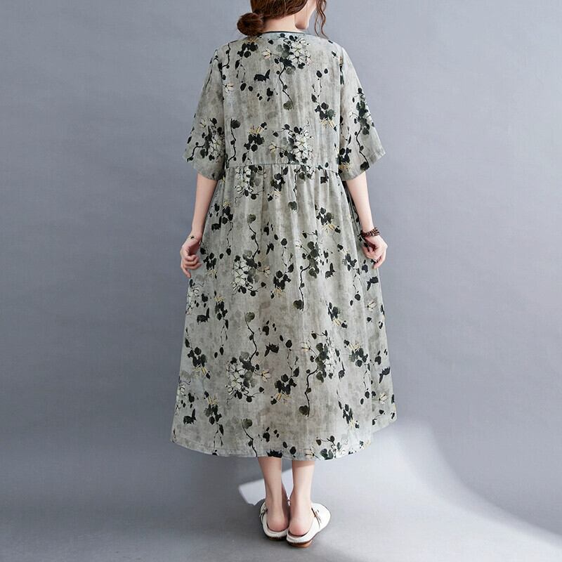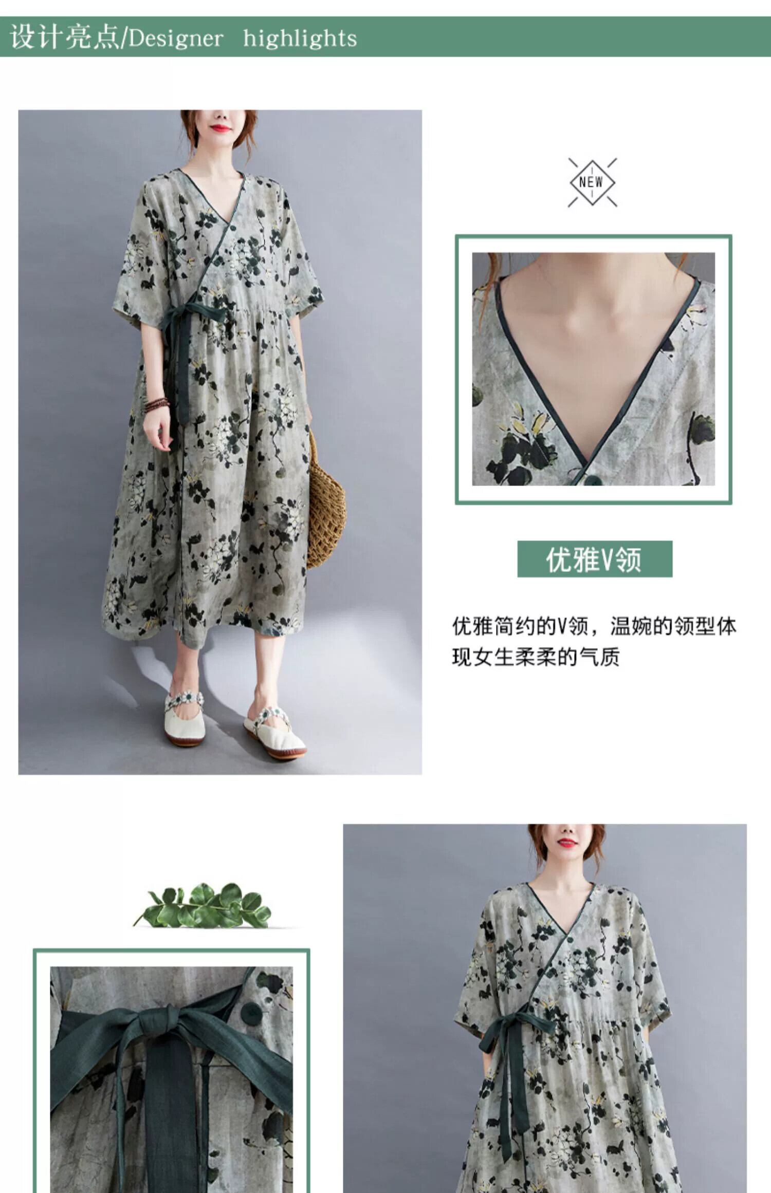 コットンとリネンのドレスの女性の 2021 夏の新作ゆったり大きいサイズスタイリッシュなレースアップウエスト斜め前立て花柄ラミーミドル丈スカート 大きめサイズ サマー 夏物 sine46618134194