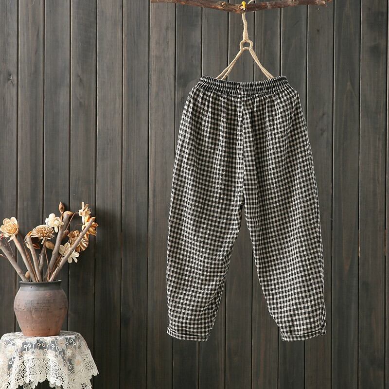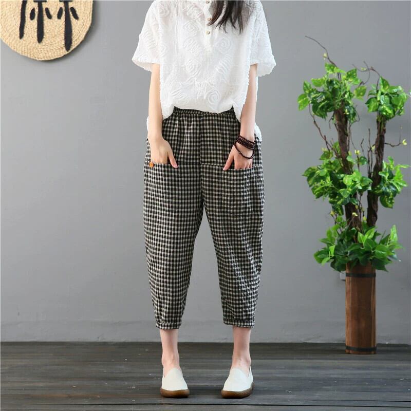 コットンとリネンのハーレムパンツの女性の夏 2021 新しい緩い大きいサイズ芸術的なレトロなチェック柄弾性ウエストカジュアルリネン 9 点パンツ エラスティック 伸縮 大きめサイズ サマー 夏物 sine80120928093