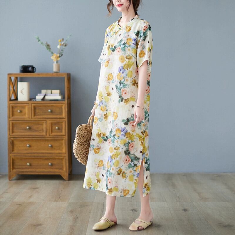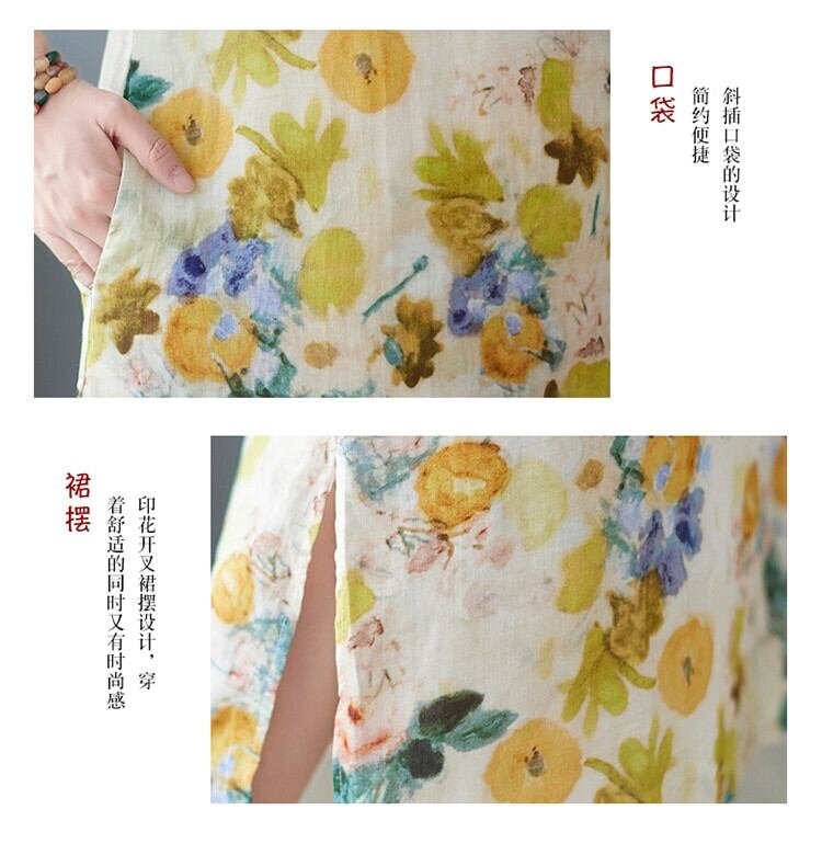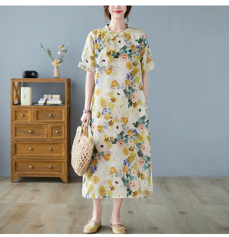 2021 新しい夏の綿とリネンのドレスルーズレトロ文学プリントスタンドカラー改良されたチャイナドレスリネンミドル丈スカート コットン サマー 夏物 sine66601719074