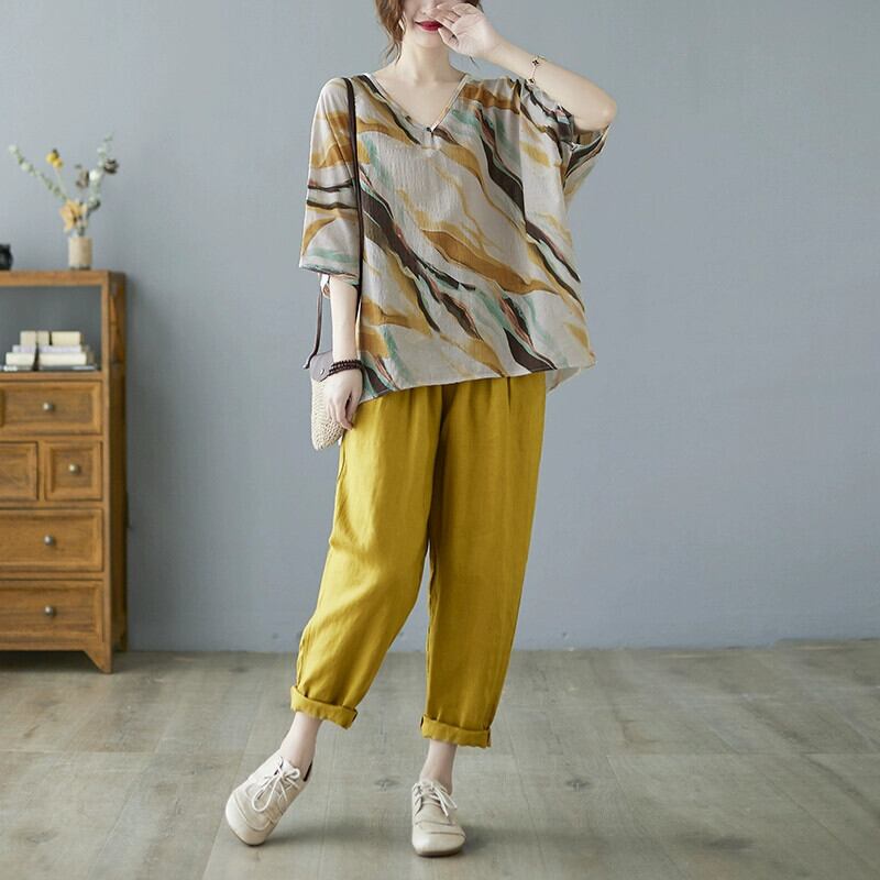 バットスリーブ綿麻Tシャツ2021夏新作ゆったり大きいサイズレディースおしゃれVネック太mm軽くて薄い七分袖トップス コットン 大きめサイズ サマー 夏物 sine27055446034