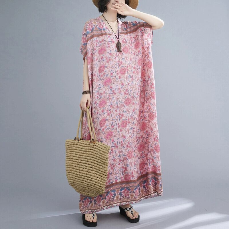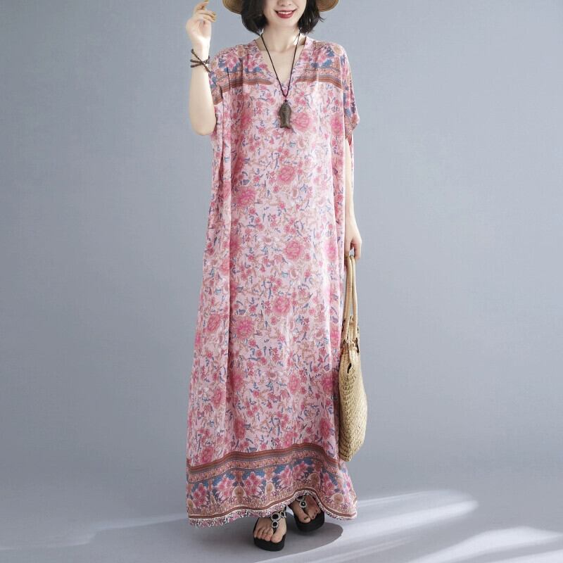 プラスサイズの女性のスタイル半袖ドレス夏 2021 新しいルーズボヘミアン V ネック花柄ローブ 大きめサイズ サマー 夏物 Vネック sine68080151397