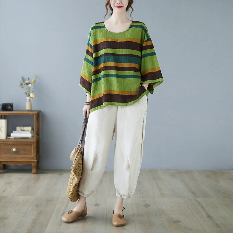 コウモリの形の七分袖 Tシャツ女性夏新ルーズ脂肪姉妹ファッショナブルなストライプのスリット綿とリネンのトッププラスサイズの婦人服 コットン 大きめサイズ sine26572235622