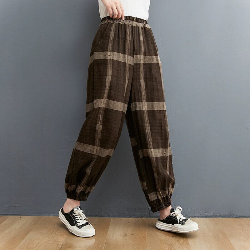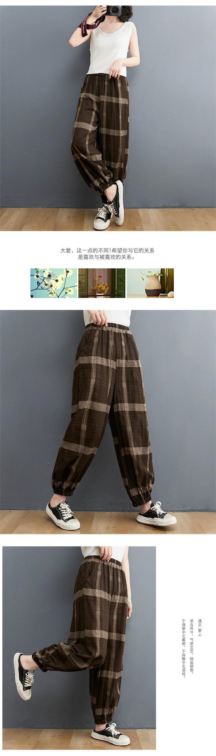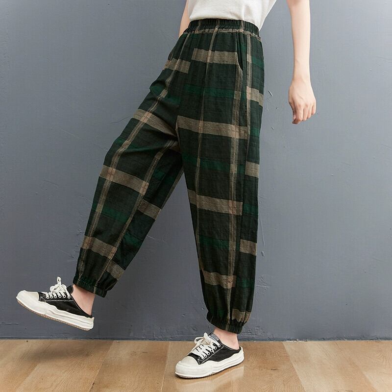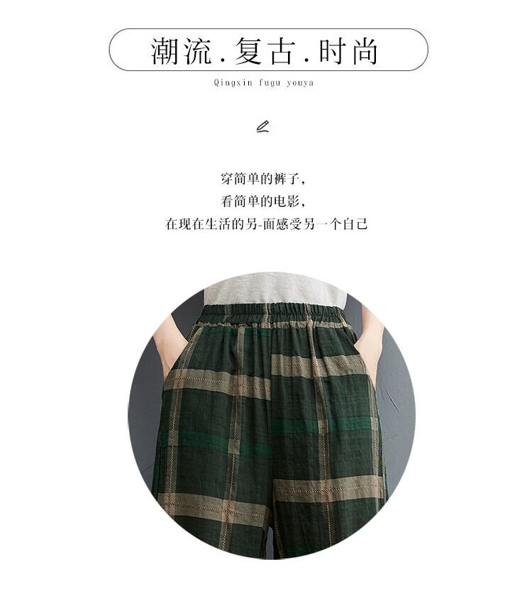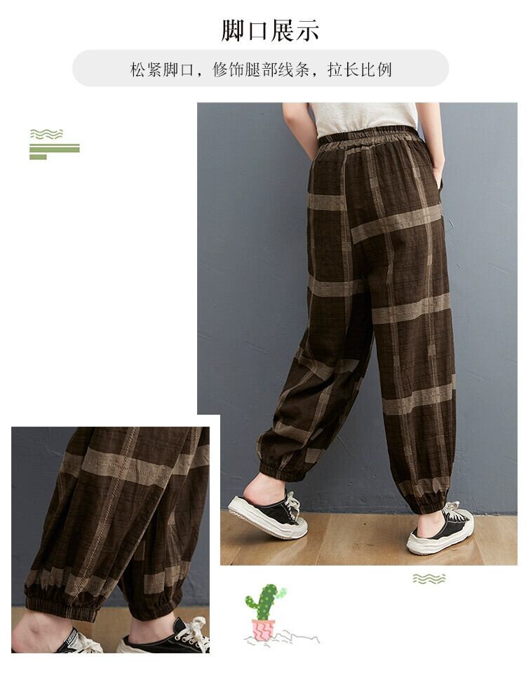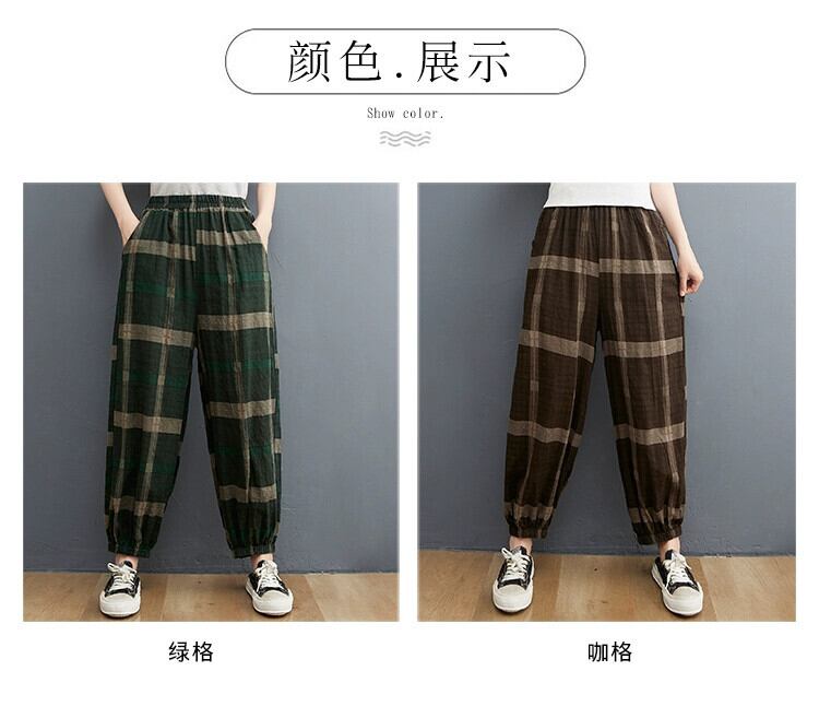 綿とリネンのブルマ女性の夏の 2021 新しい緩い大きいサイズ芸術的なチェック柄レッグタイハーレムリネンカジュアル 9 点パンツ コットン 大きめサイズ サマー 夏物 ショーツ ブルマー sine84688477925