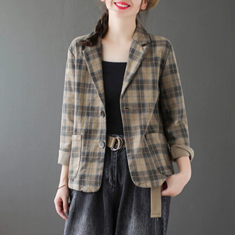 クリアランス漏れ〜大手有名貿易の直前カットラベル付き婦人服長袖ショートコートレトロコットンとリネンのチェック柄スーツに対抗します ロング sine90953606578
