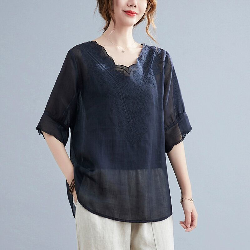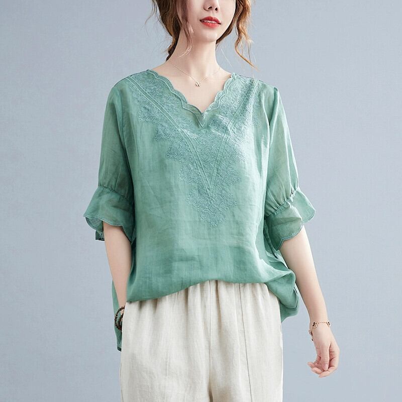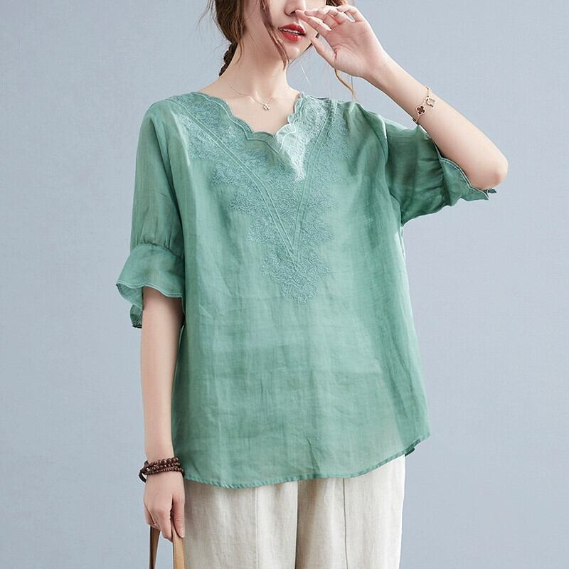 文学レトロなコットンとリネンの女性スーツ、夏の刺繍入り V ネック半袖 T シャツ トップ、カジュアルなハーレム パンツとリネンの 2 点セット レッド サマー 夏物 Vネック Tシャツ sine67096744959