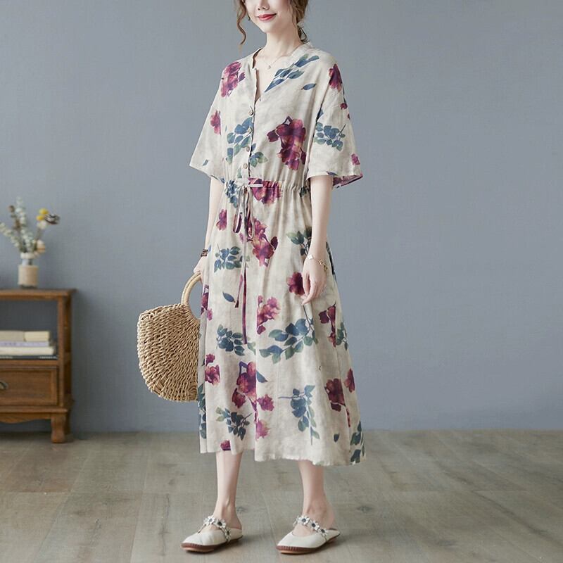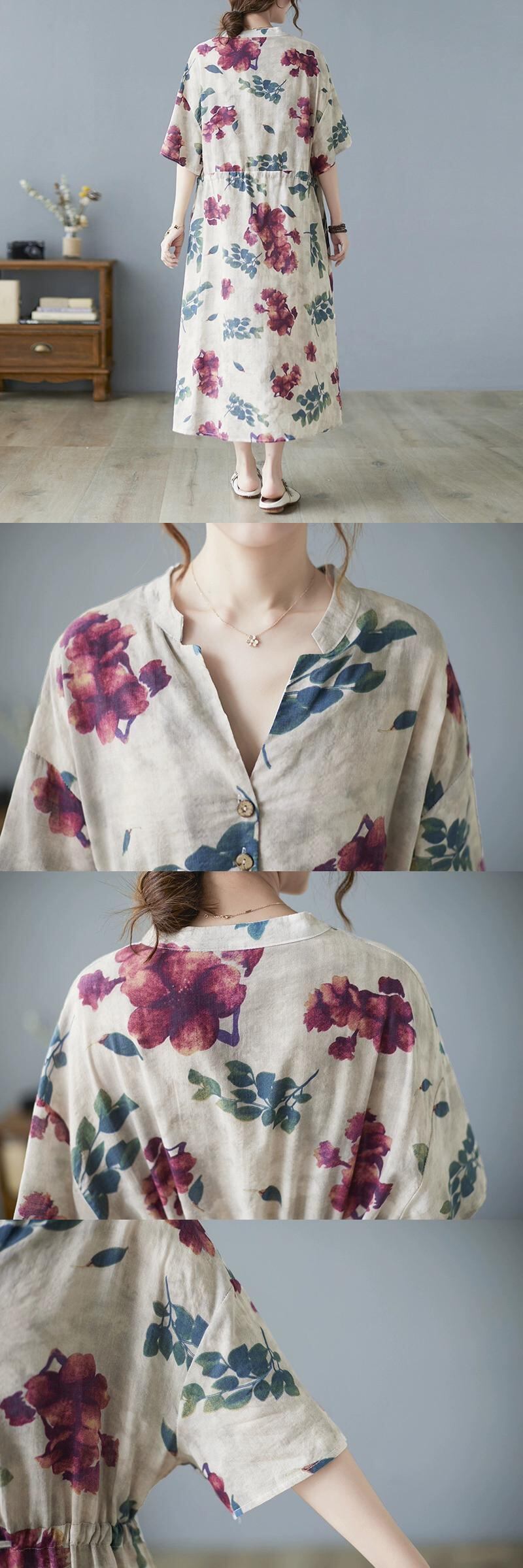気質 V ネックコットンとリネンのドレス夏ルーズプラスサイズの女性の脂肪 mm 年齢を軽減する花の色のレースのミドル丈のシャツドレス 大きめサイズ サマー 夏物 Vネック フラワーデザイン sine14805454338
