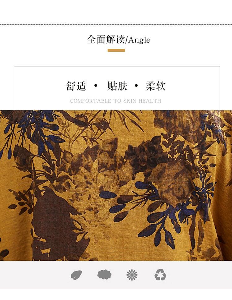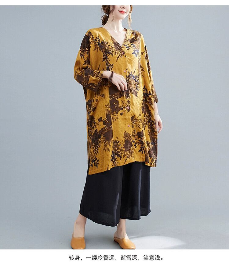 プラスサイズの女性の綿とリネンのシャツドレスの女性の夏ルーズ脂肪ミリメートル中国風水墨画 V ネックミッドレングスドレス コットン 大きめサイズ サマー 夏物 Vネック sine52308550741