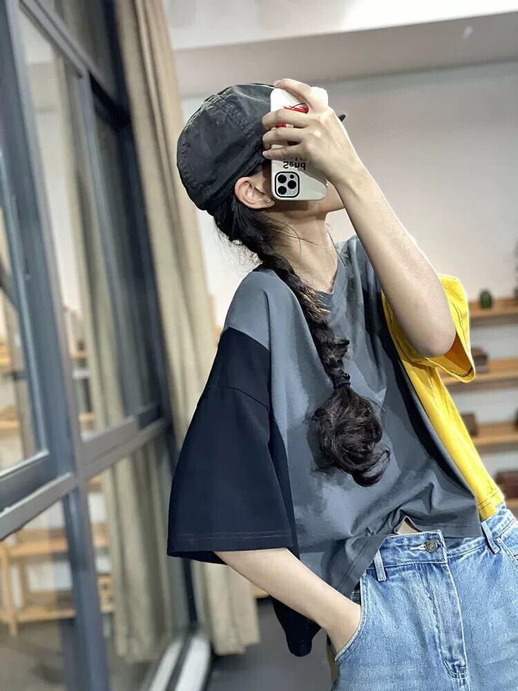 Eign Trade and South オリジナル シングルテール グッズ カット ラベル レディース ルーズ ボトム トップ バット シャツ レトロ コントラスト カラー カジュアル 半袖 Tシャツ sine74473210624