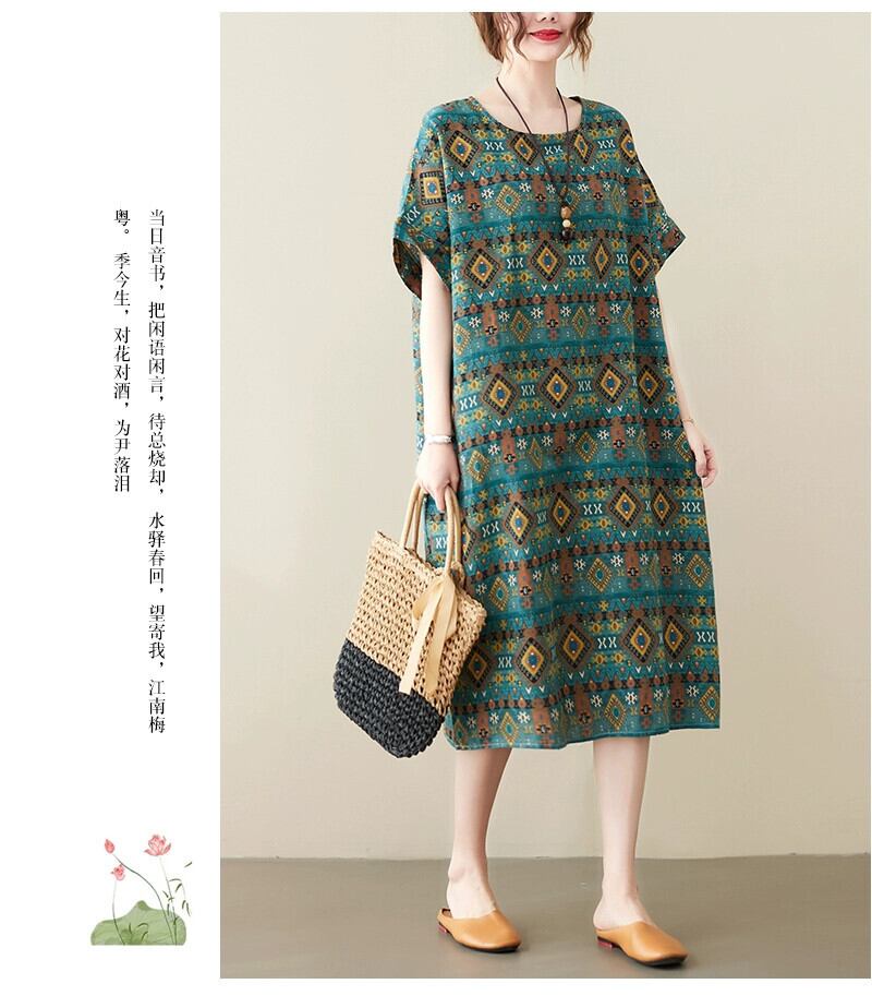 西洋風のレトロなコットンとリネンのドレスの女性、夏ルーズ、ファットシスター、大きいサイズのプリント、痩身、薄いリネンのミドル丈スカート 大きめサイズ サマー 夏物 sine15264394507