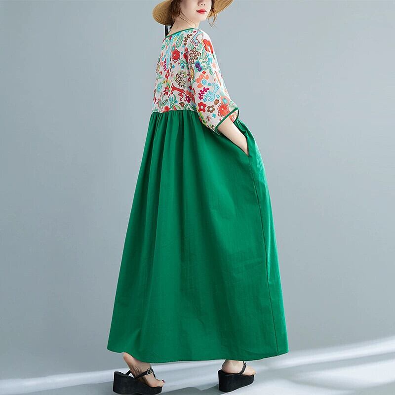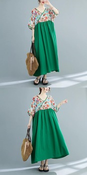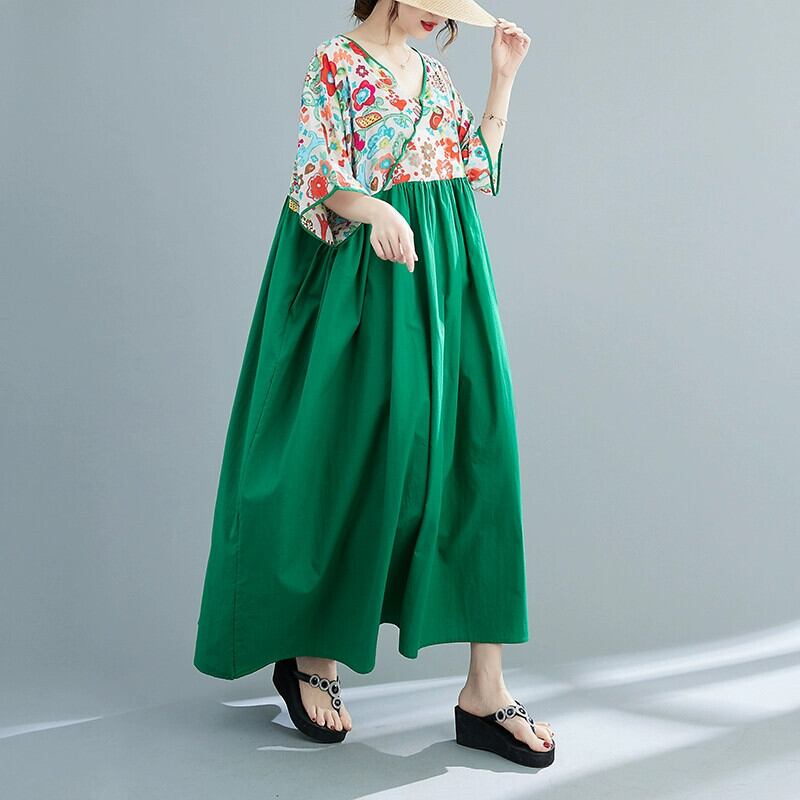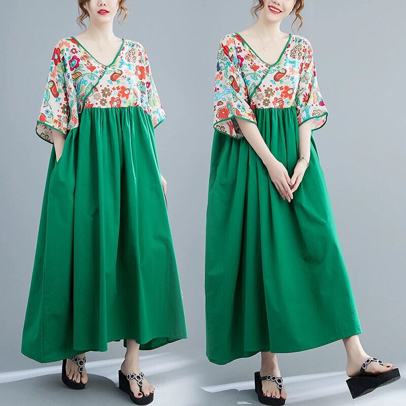 200 プラスサイズの女性の半袖ドレス夏ルーズファットシスターレトロプリントステッチ V ネックハイウエスト大きな裾ローブ ハイウェスト 大きめサイズ サマー 夏物 Vネック sine3785008024