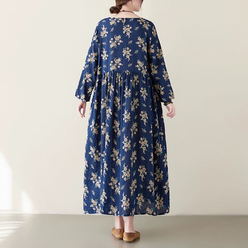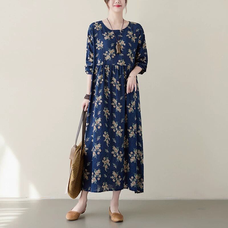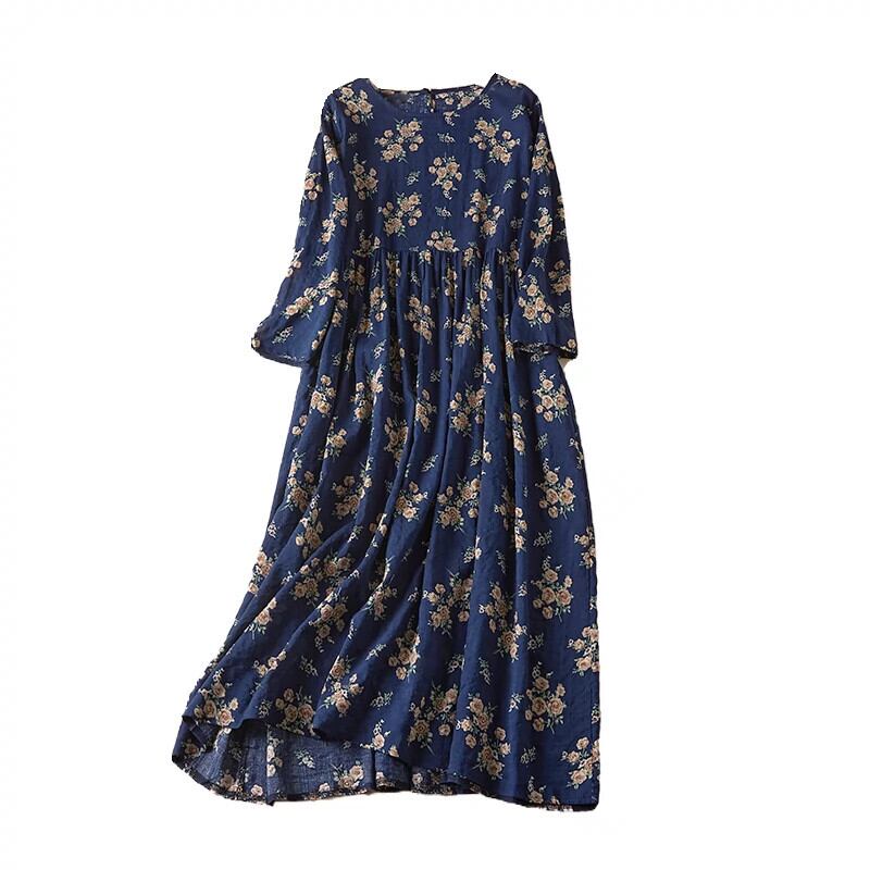 第一線のブランド eign trade 最後の在庫の女性の花柄長袖ラミー ロング スカート ルーズ レトロ コットンとリネンのドレス sine61903989083