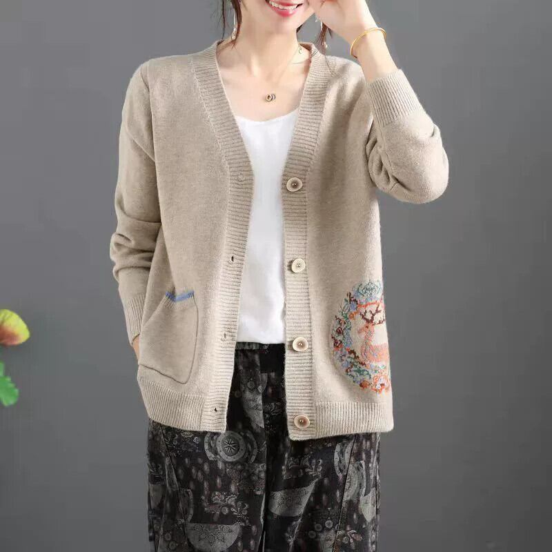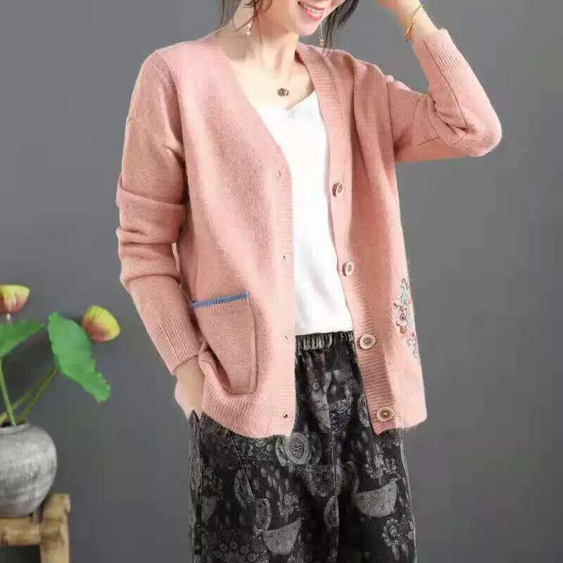 クリアランスリーク〜eseオリジナルレトロ刺繍Vネックセータージャケットレディース、ルーズスリム長袖カーディガントップ ロング レッド sine8335658156