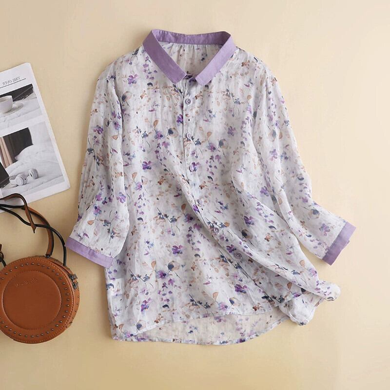 第一線ブランド eign trade 最終在庫レディース レトロ プリント コットンとリネン半袖シャツ ルーズ スリミング リネン 薄手 トップ sine33017937078