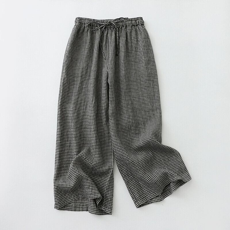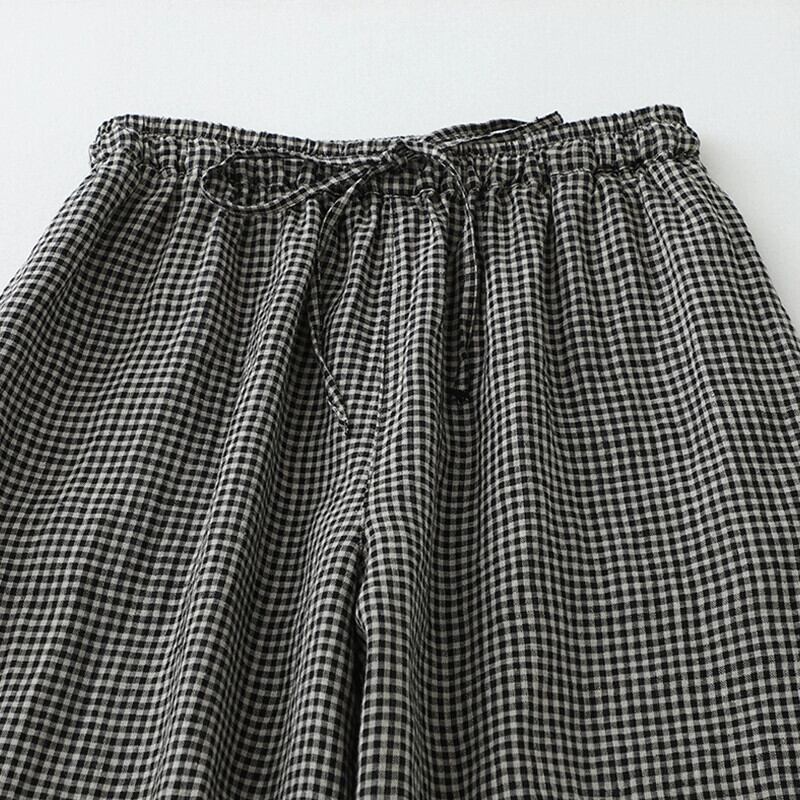 ディスカウントストアショッピングモール撤退夏レトロリネンチェック柄カジュアルパンツレディースルーズコットンとリネンの9点ワイドレッグパンツ サマー 夏物 sine44081888388