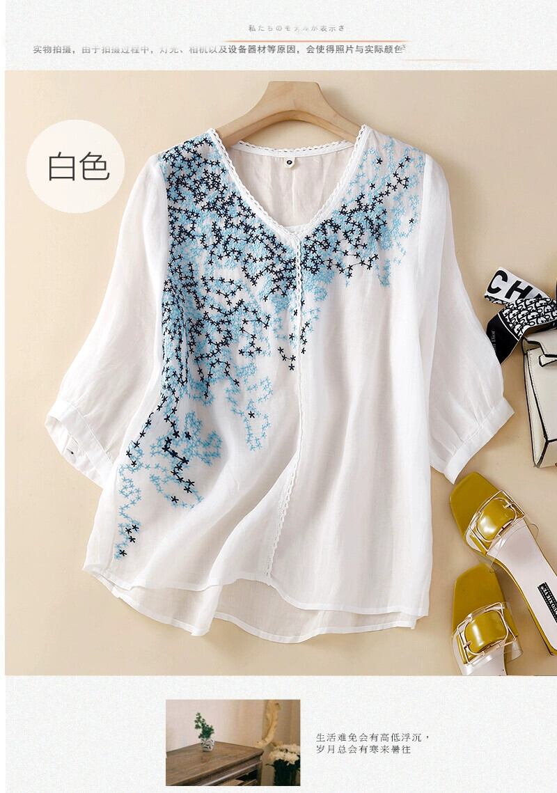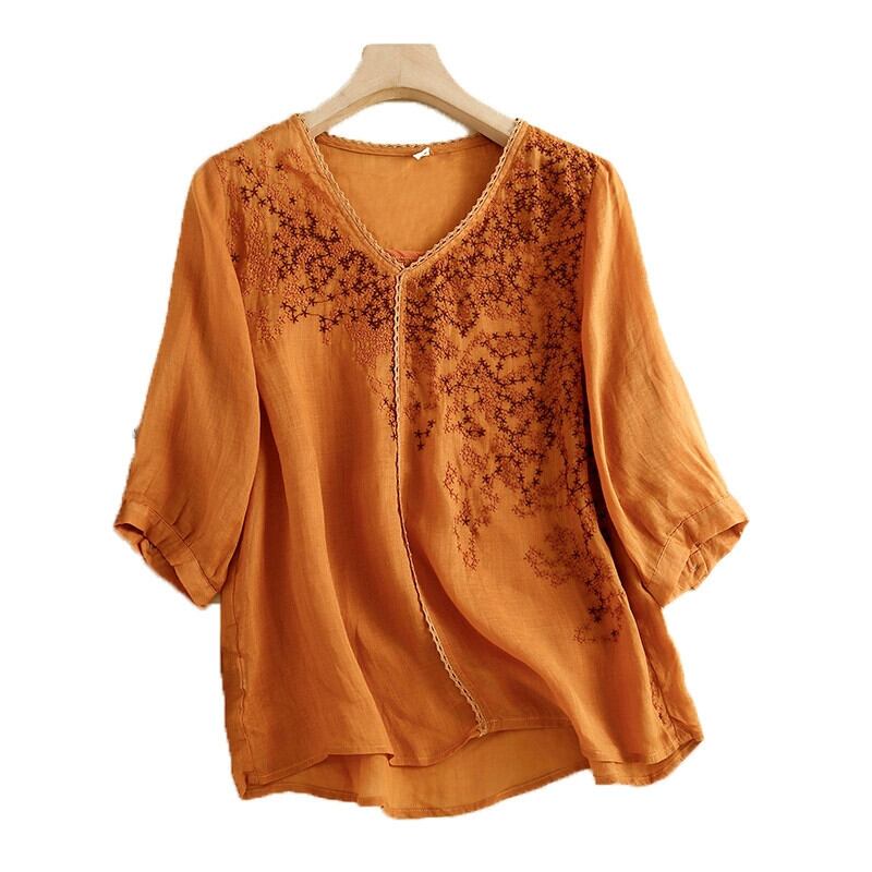 クリアランス クリアランス カウンター 牛グッズ 引き出し レディース レトロ V ネック ラミー 薄手 トップ ルーズ 刺繍 コットンとリネン 半袖シャツ レッド Vネック sine2326593424