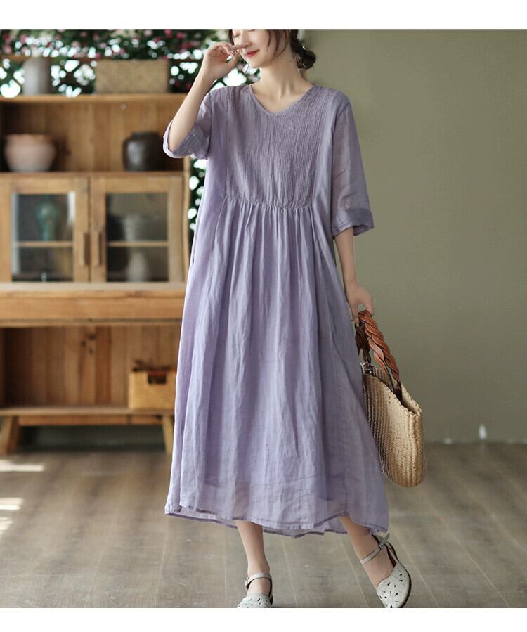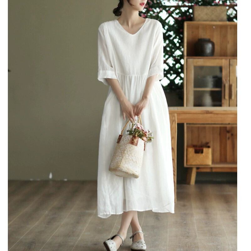 ディスカウント ストア ショッピング モールの女性の文学アコーディオン プリーツ コットンとリネンのドレス ルーズ V ネック リネン ミドル丈スカート夏 サマー 夏物 Vネック sine88530230292