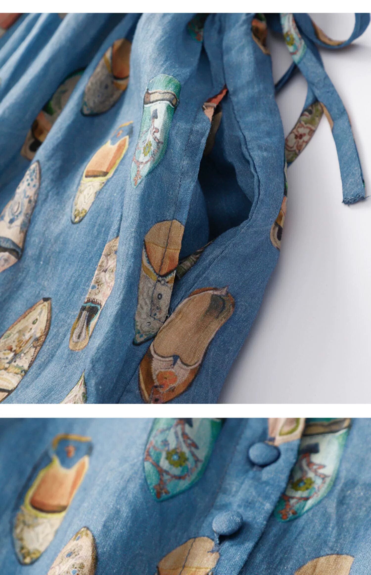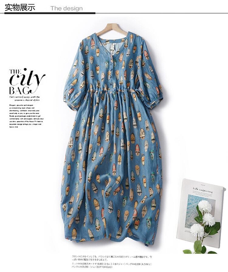 ビッグブランドテールグッズのクリアランスカウンター撤去ウエストタイ付きレディースプリントVネック半袖コットンリネンドレスAラインミドル丈スカート sine76175052168