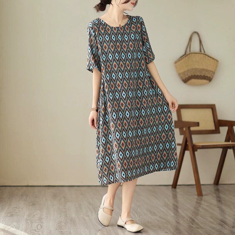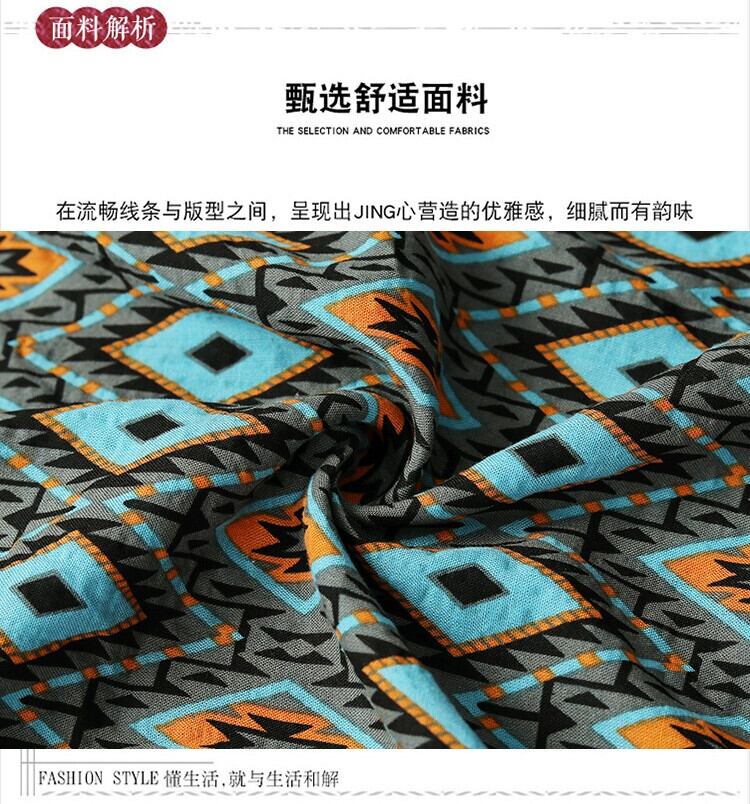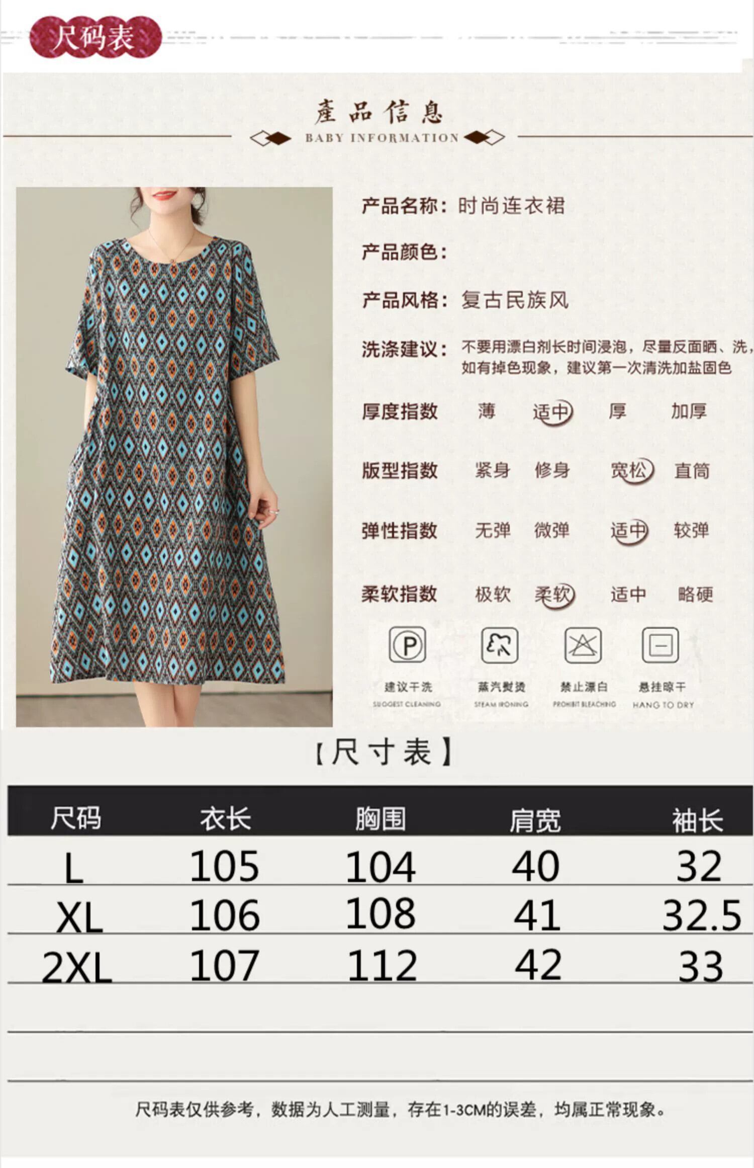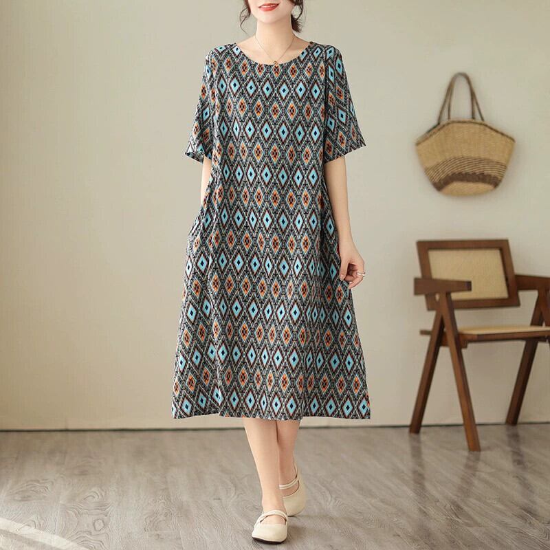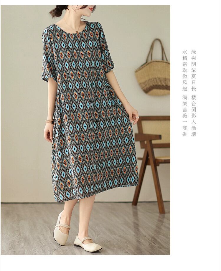 eign trade 割引ブランドテールグッズ女性の綿とリネンのプリント半袖ドレス夏ルーズ半袖リネン a ラインスカート コットン サマー 夏物 Aライン sine19176075789