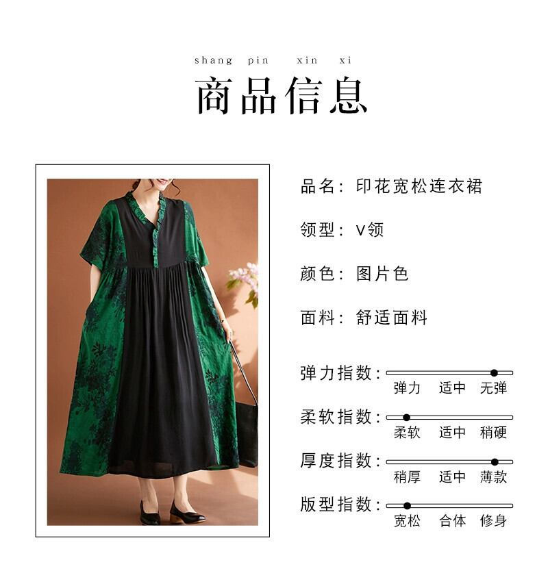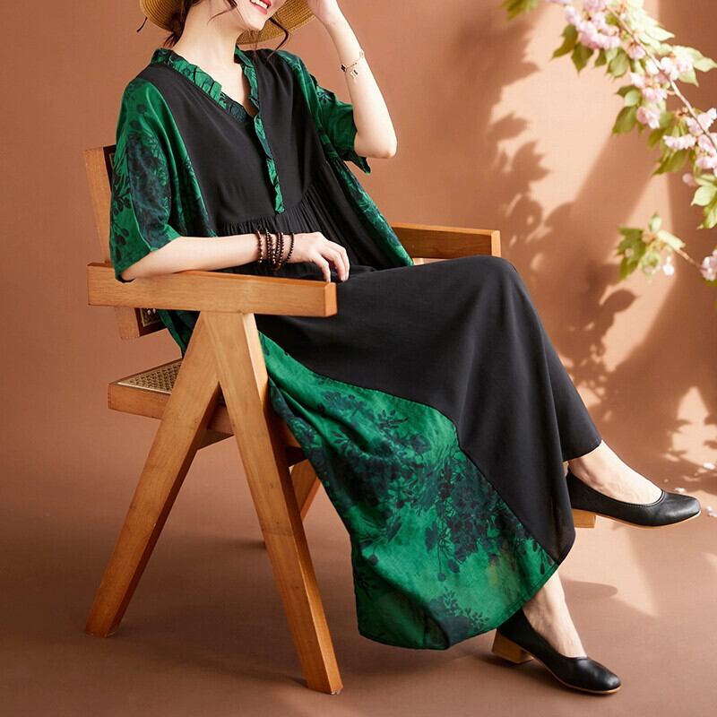 クリアランス漏れ〜カウンターからの、レトロなスプライシングプリントのコットンとリネンのドレス、大きな裾のゆったりとした大きいサイズのVネックリネンスカート。 大きめサイズ sine82937844373