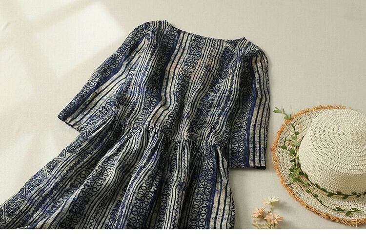 行方不明〜カウンターの有名なラミー膝丈スカート、レトロなストライプのウエストレースアップVネック半袖コットンリネンドレス sine97234261742