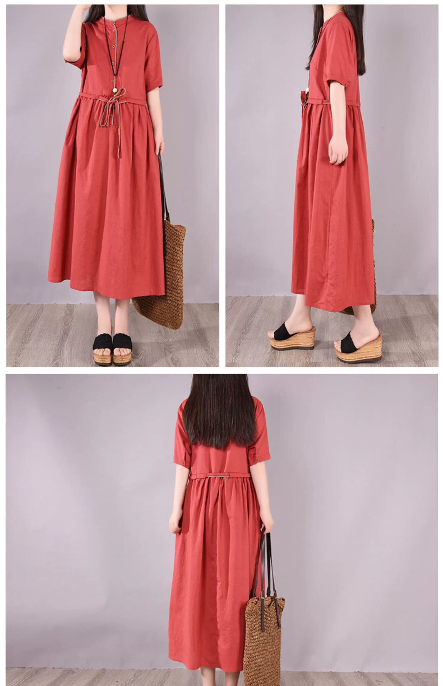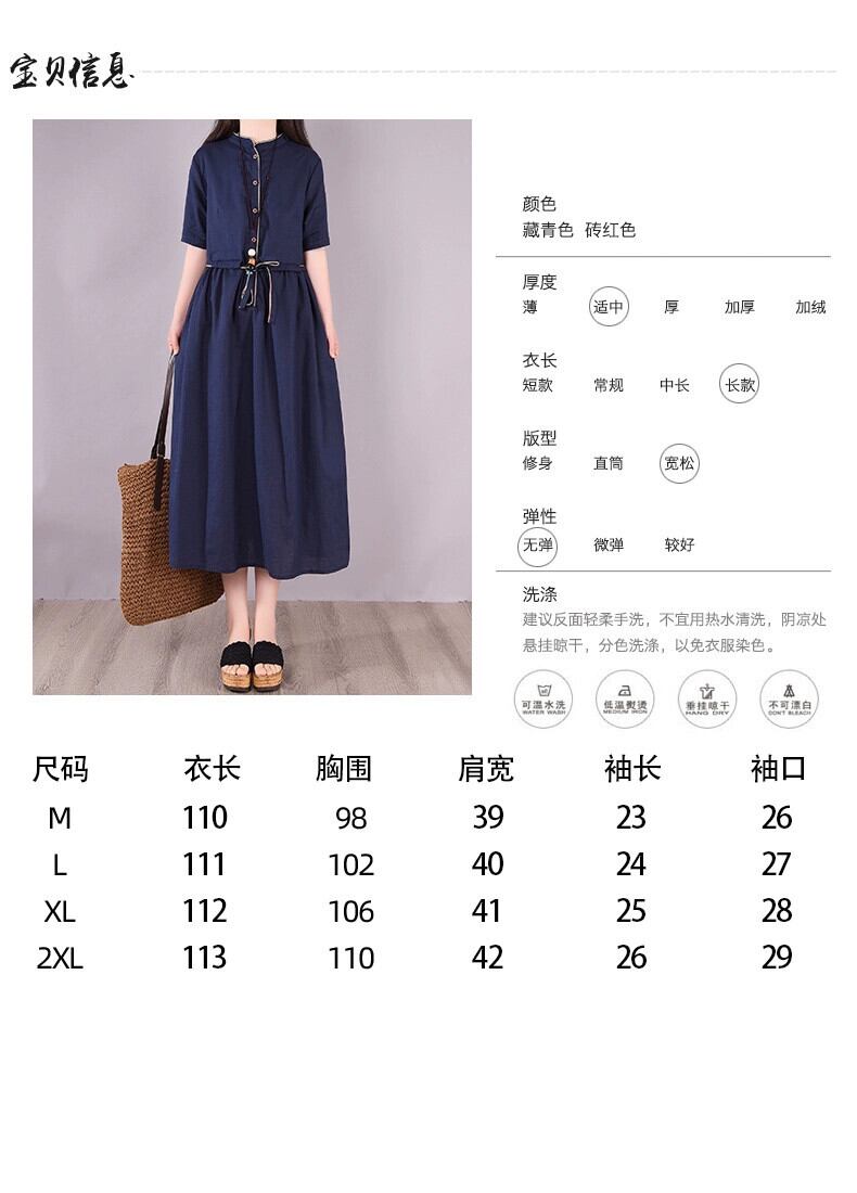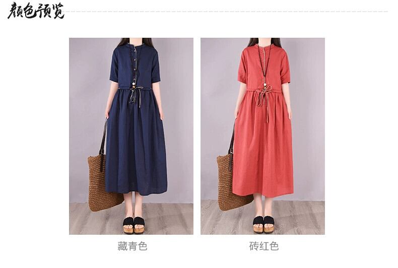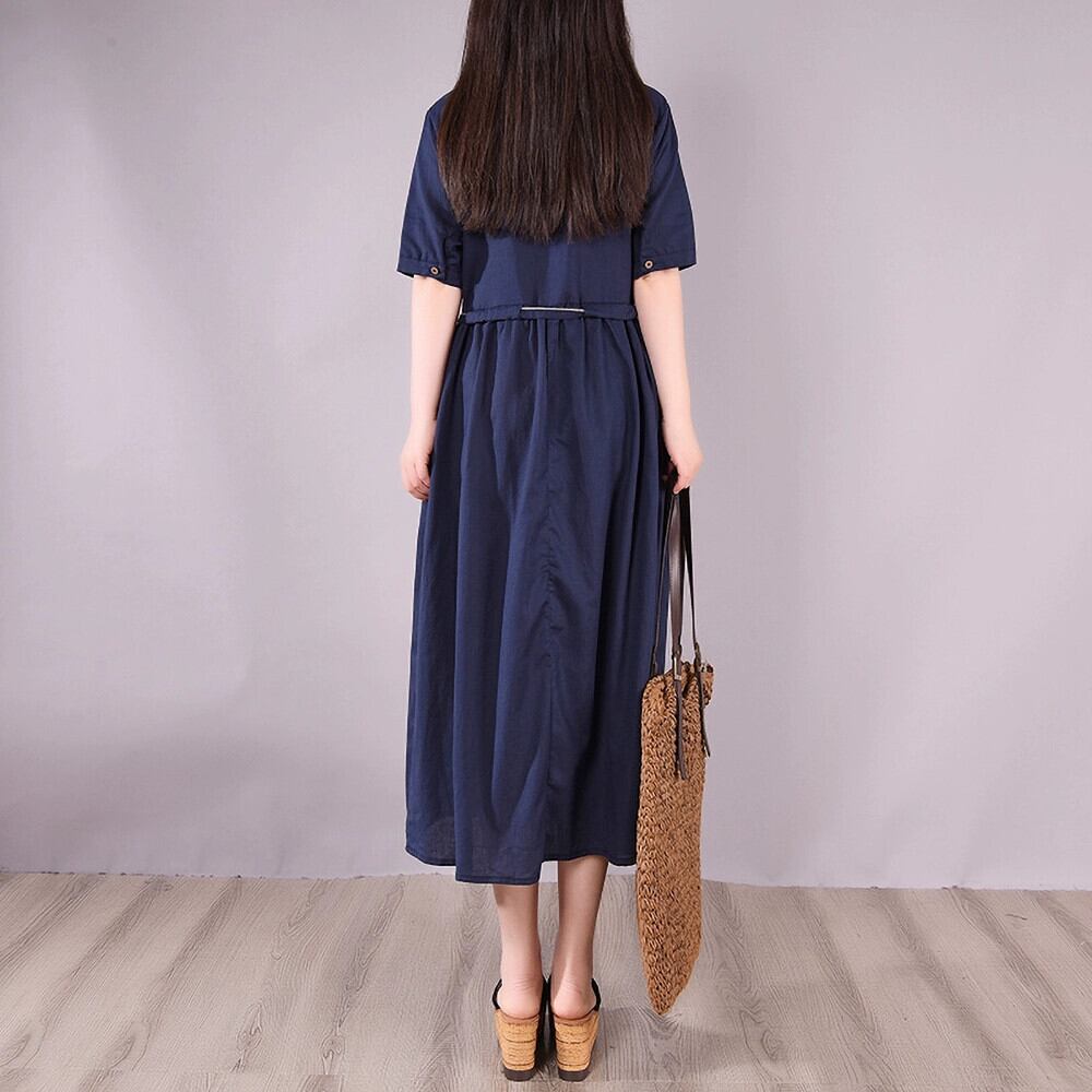 Eign Trade ビッグネーム カットテール シングル レディース スタンドアップ カラー ラミー シャツ 膝上ロング スカート ルーズ 半袖 コットン リネン ドレス sine41384194574