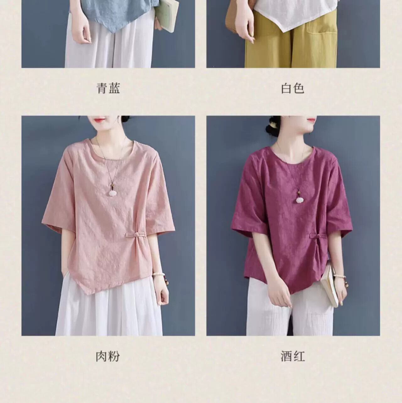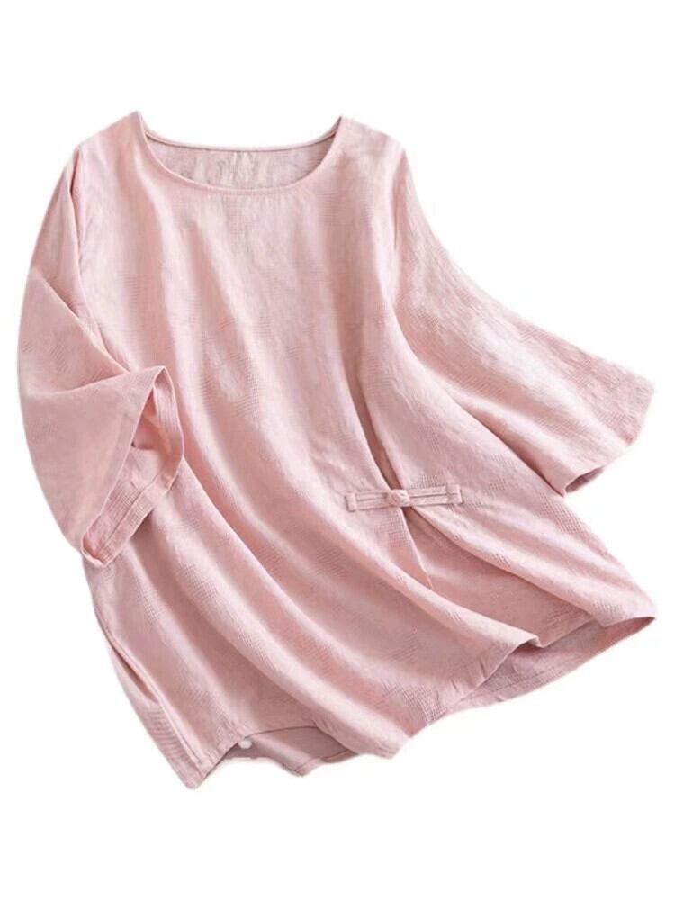 クリアランスリーク〜eseオリジナルレトロジャカードコットンとリネンの七分袖トップ女性ルーズ不規則な半袖Tシャツ夏 サマー 夏物 sine42082611332